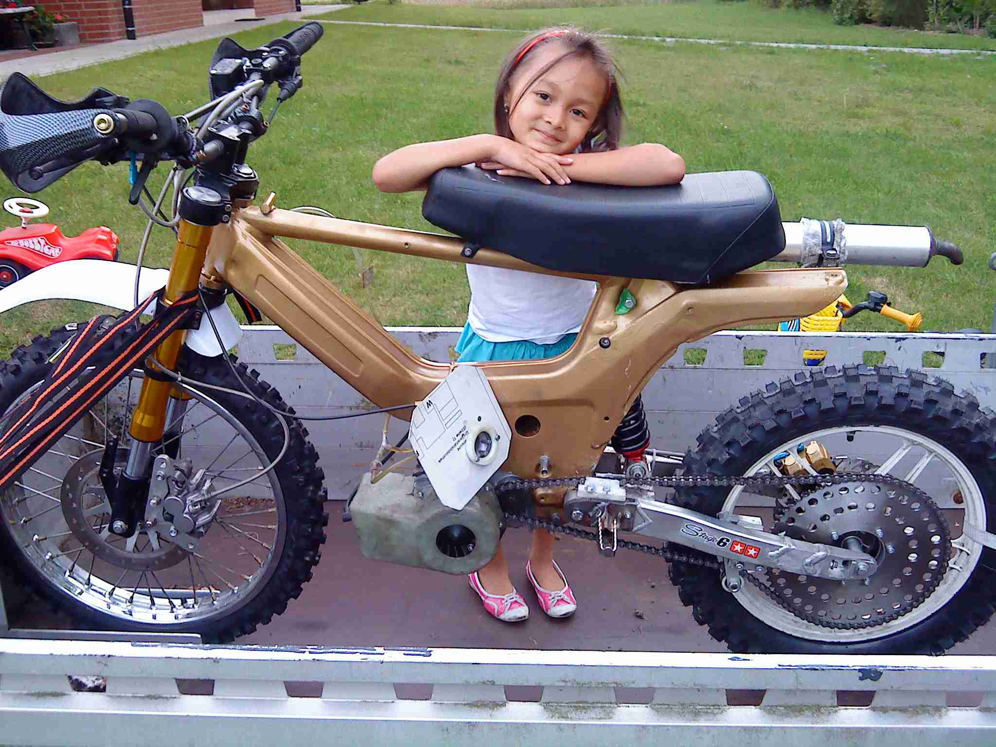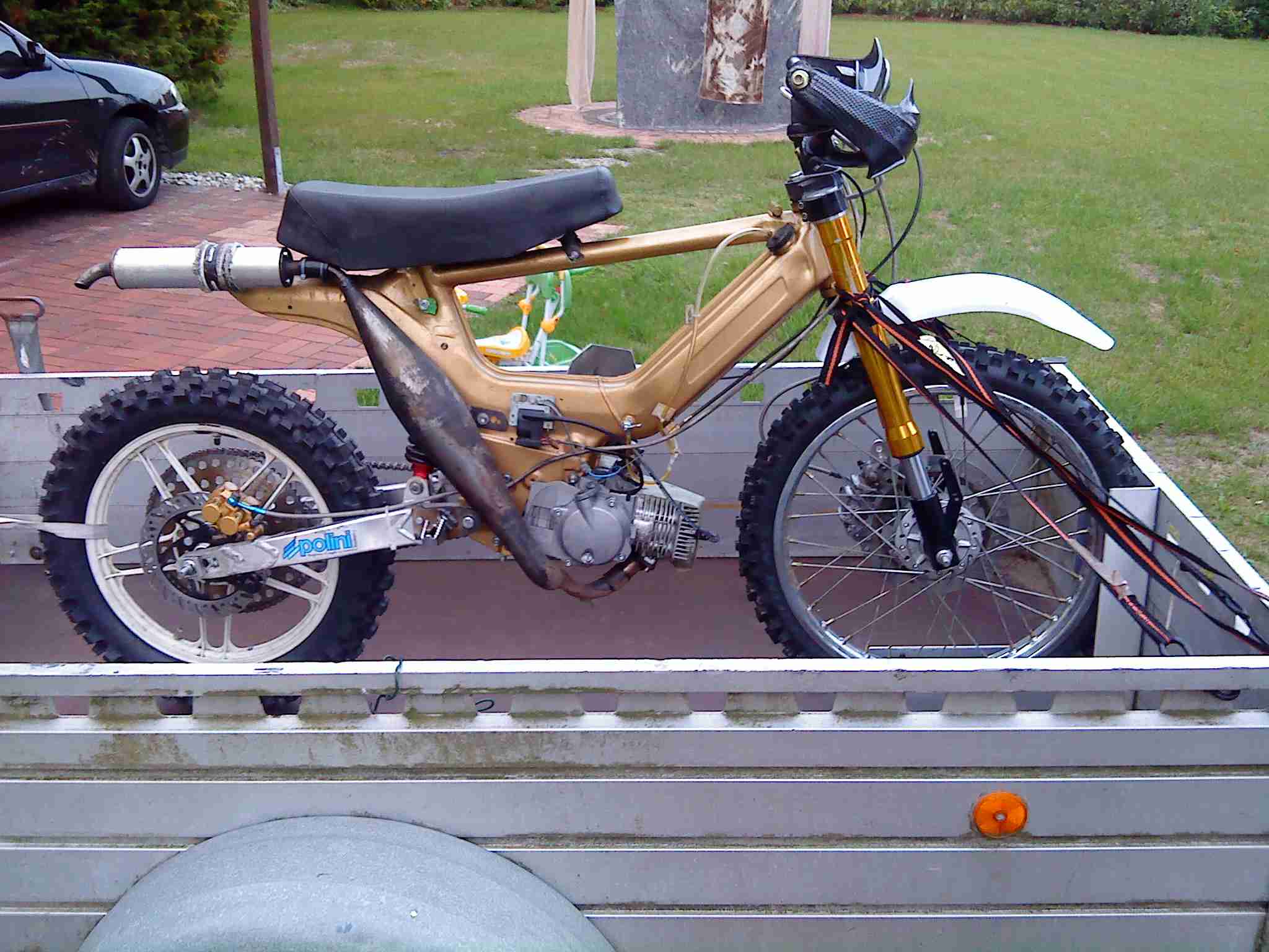 Ich gehe gern den Weg der Leistung aus einem Motor mit entsprechenden Änderungen- bei den Evels oder den Kolbenfressern z.b. sind Anbauteile an der Mofa, die einen alleine vom Geld her erblassen lassen- Axels Monogabel alleine 1600€, +Vorderrad und Bremsanlage- Gesamtgewicht der Mofa: 28,2 Kg.. Evels kiste besteht aus einer Kawasaki KX85- Gewicht rd. 35Kg- und so eine steht ja zum Ausschlachten auch für schmales Geld an jeder Ecke.. oder nicht?