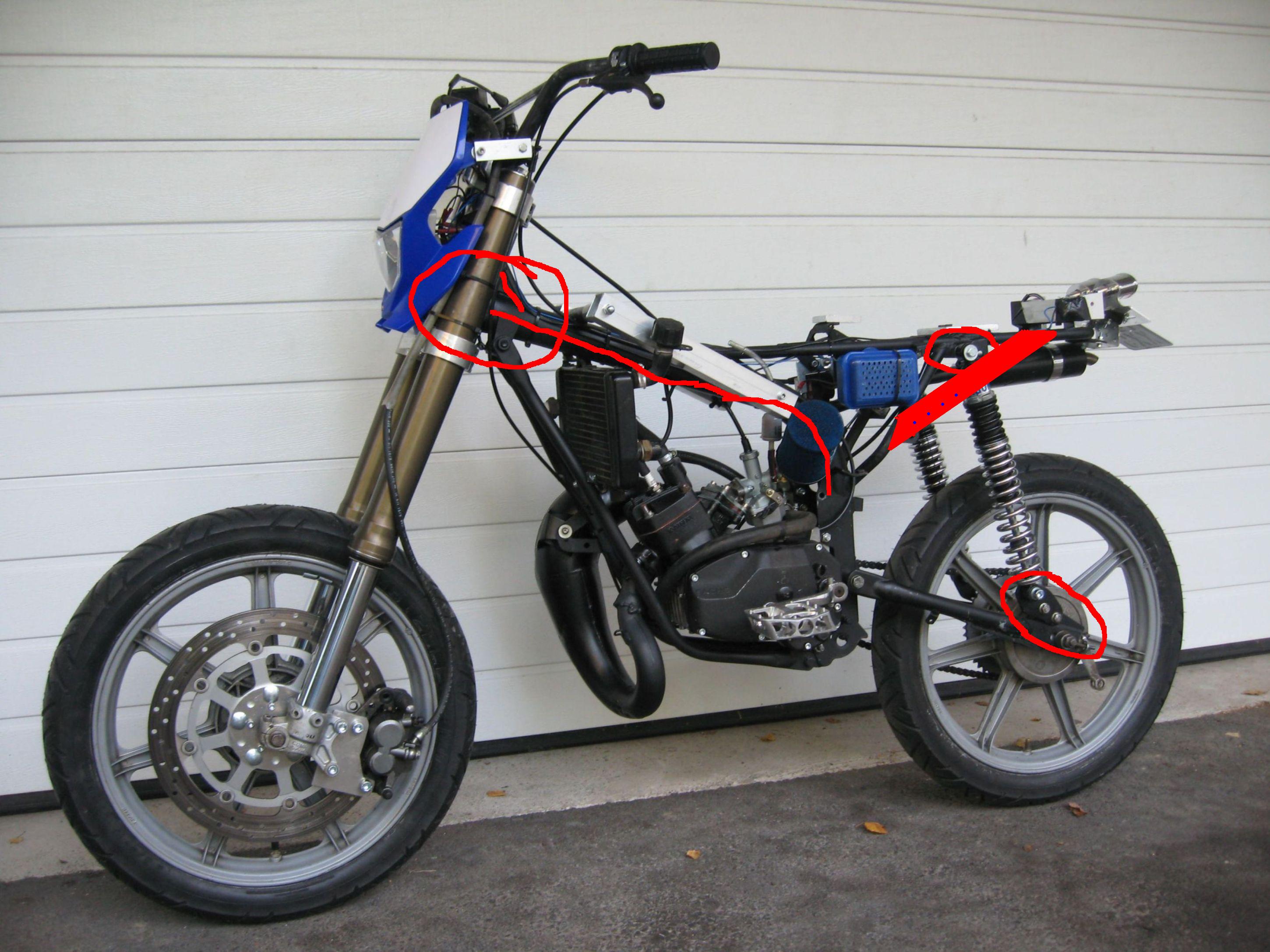 achja mein rahmen is oben links in dem markierten feld angerissen, und das dicke hauptrohr hat sich nach ca 10 rennen verbogen ;( ;(