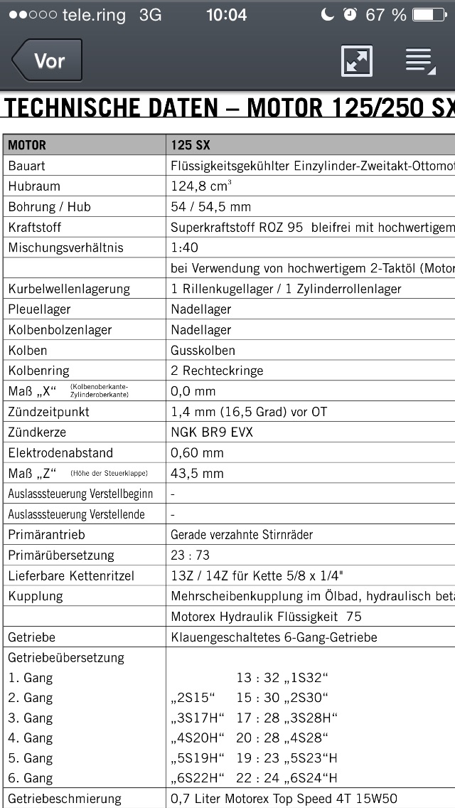bei der Zündkerze kann ich dir ja nur uneingschränkt zustimmen, ne Kerze kost nur nen Bruchteil im Vergleich zu nem möglichen Schaden am Zylinder. und das die von KTM vorgeschriebene Kerze in den Eigenschaften hochwertiger ist steht ja ausser Frage.