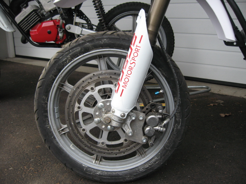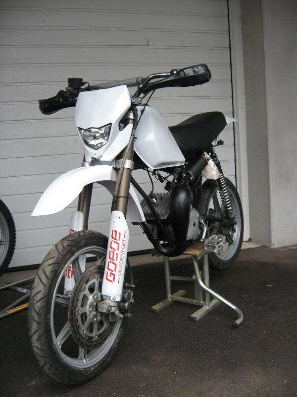 Also, der Rahmen der Racing4fun (roter Motorblock ) ist bereits im letzten Jahr in Dortmund gelaufen, damals noch mit einer verlängerten Ultra-Gabel. Diese Gabel sprach leider nicht fein genug an und so hatten wir viele Rutscher und einfach ein bescheidenes Fahrgefühl, zudem vertragen die original Lenkkopflager auf Dauer keine harten Schläge. So ist jetzt dort eine Gabel aus einer KX 80 ( Jugendcrosser ) verbaut. Die Lageraufnahme besteht aus zwei 6 cm langen Stahlhülsen, in die die Lagersitze eingedreht sind. Danach wurden die Hülsen über das original Lenkschaftrohr geschoben und verschweißt. Ist super stabil und so behalte ich die handliche Mofageometrie bei.