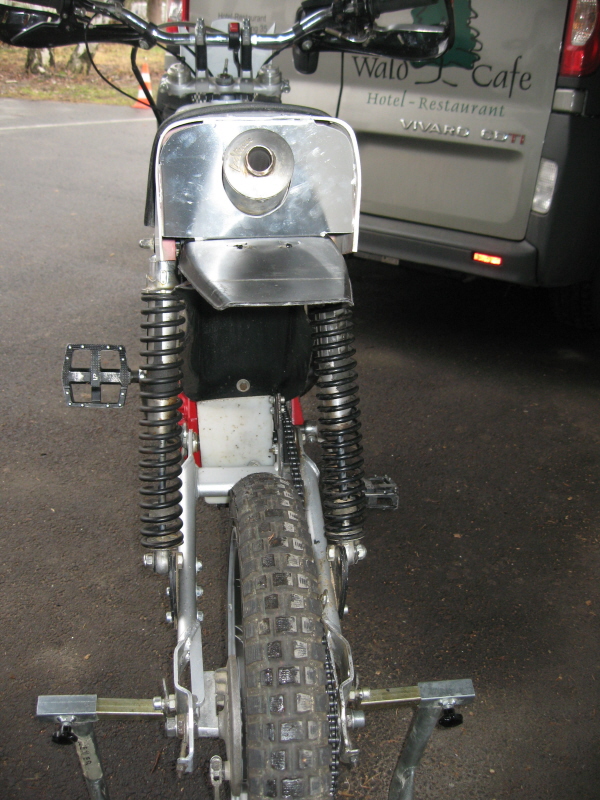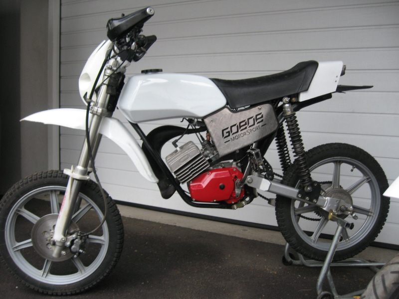 Der Motor ist ein originaler GT-Block mit Suprakurbelwelle, 50ccm Athenazylinder, 20er Bing mit 105er Düse, PVL, eigentlich alles Mofasportstandart. Auspuff ist vom 65ccm Crosser mit einem LeoVince ESD unterm Heck. Damit die Geometrie hinten wieder zur Gabel paßt ,hab ich mir aus zwei Stahlplatten die Stoßiaufnahme geflext und das ganze mit zwei Federbeinen aus der seligen XL 500S auf das passende Niveau gehoben.. Fährt sich handlich und ist trotzdem stabil - Lude, Du hast sie schon in Desenberg gesehen, bevor Elle sich damit den Berg runterstürzte.