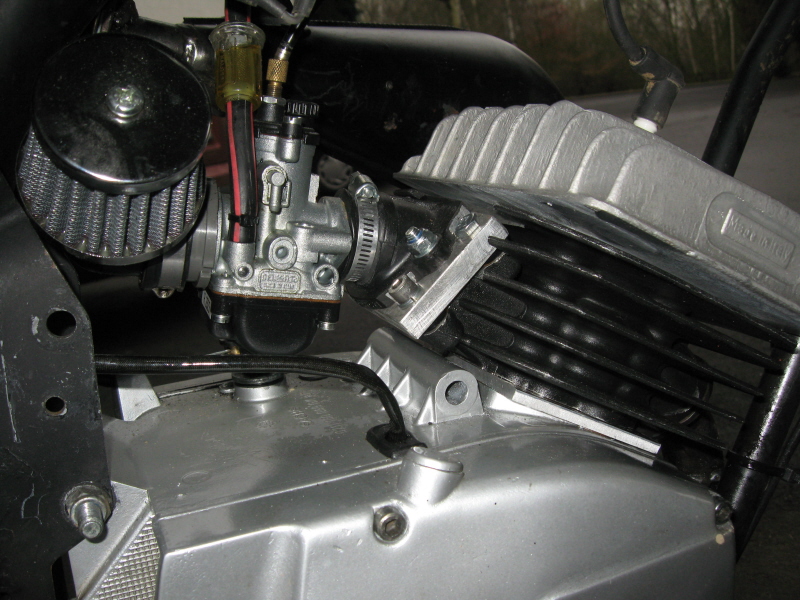 Motor ist hier der Membranzylinder, der mir vor einigen Wochen auf dem Prüfstand hochgegangen ist. Da es für den abgebrochenen Kolben keinen direkt passenden Ersatz gab, hab ich einen Prox-Kolben einschleifen lassen. Dieser Kolben hat jedoch eine andere Bauhöhe, als der Metrakitkolben, so mußte ich den Zylinder mit einem selbstgefrästen Spacer um 5 mm anheben. Dazu hab ich den Auslaß noch minimal angepaßt , damit sind die Steuerzeiten jetzt 186 Grad Auslaß und 130 Grad für die Überströmer. Sicher nicht meine Traumsteuerzeiten, aber irgendwie werden wir schon vom Fleck kommen. Der Metrakitzylinderkopf ließ sich nicht so schön bearbeiten, deshalb hab ich einen Parmakitkopf solange mit Drehbank und Fräse gequält, bis eine gemessene Verdichtung von 11,1:1 bei einer Quetschkante von 0,6 mm herausgekommen ist. Allein am Kopf hab ich 8 Stunden gewerkelt, bis ich genau die Kontur hatte. Zum Einfahren ist jetzt erstmal ein 18er Dellorto drauf.
