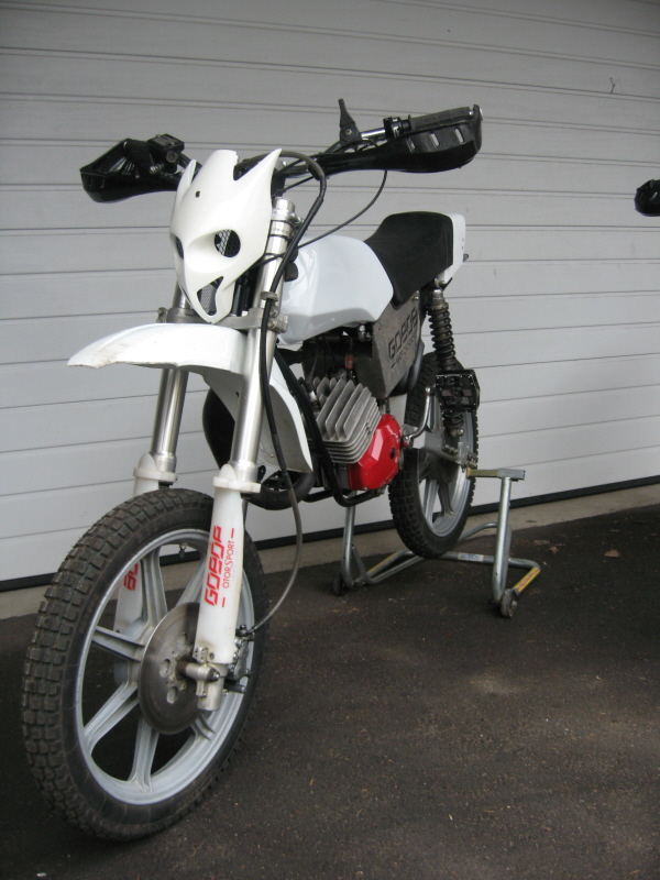 Der Motor ist ein originaler GT-Block mit Suprakurbelwelle, 50ccm Athenazylinder, 20er Bing mit 105er Düse, PVL, eigentlich alles Mofasportstandart. Auspuff ist vom 65ccm Crosser mit einem LeoVince ESD unterm Heck. Damit die Geometrie hinten wieder zur Gabel paßt ,hab ich mir aus zwei Stahlplatten die Stoßiaufnahme geflext und das ganze mit zwei Federbeinen aus der seligen XL 500S auf das passende Niveau gehoben.. Fährt sich handlich und ist trotzdem stabil - Lude, Du hast sie schon in Desenberg gesehen, bevor Elle sich damit den Berg runterstürzte.