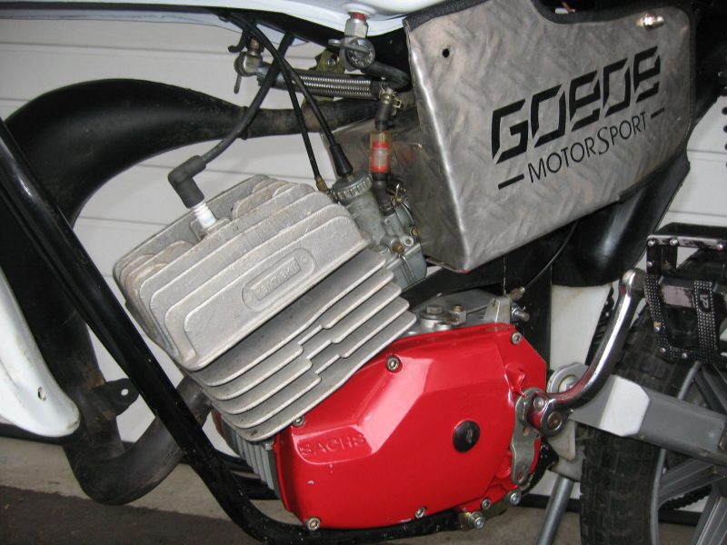 Der Motor ist ein originaler GT-Block mit Suprakurbelwelle, 50ccm Athenazylinder, 20er Bing mit 105er Düse, PVL, eigentlich alles Mofasportstandart. Auspuff ist vom 65ccm Crosser mit einem LeoVince ESD unterm Heck. Damit die Geometrie hinten wieder zur Gabel paßt ,hab ich mir aus zwei Stahlplatten die Stoßiaufnahme geflext und das ganze mit zwei Federbeinen aus der seligen XL 500S auf das passende Niveau gehoben.. Fährt sich handlich und ist trotzdem stabil - Lude, Du hast sie schon in Desenberg gesehen, bevor Elle sich damit den Berg runterstürzte.