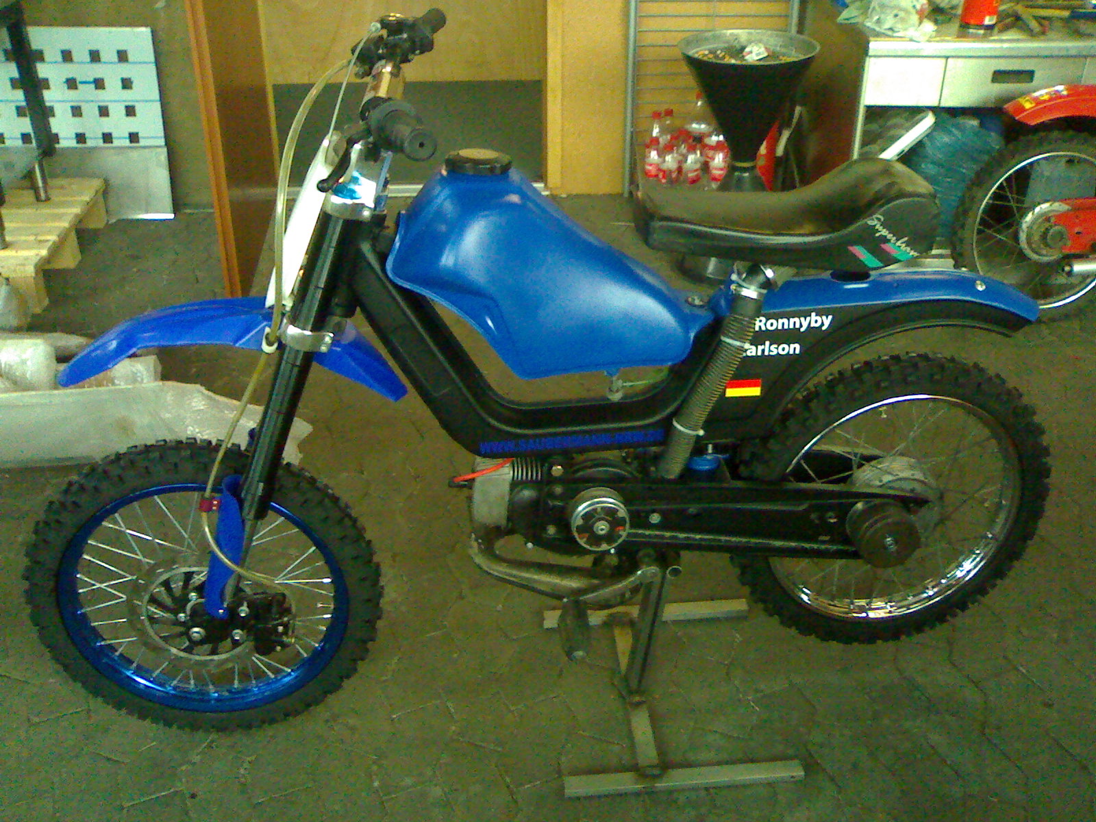 Das gute Stück hat nen Polini Evolution Motor mit Athena Zylinder, 19´er Vergaser, Malossi TooBad Auspuff, Malossi Multivar , die altbewährte Dirtbikegabel, Scheibenbremse vorn und hinten...