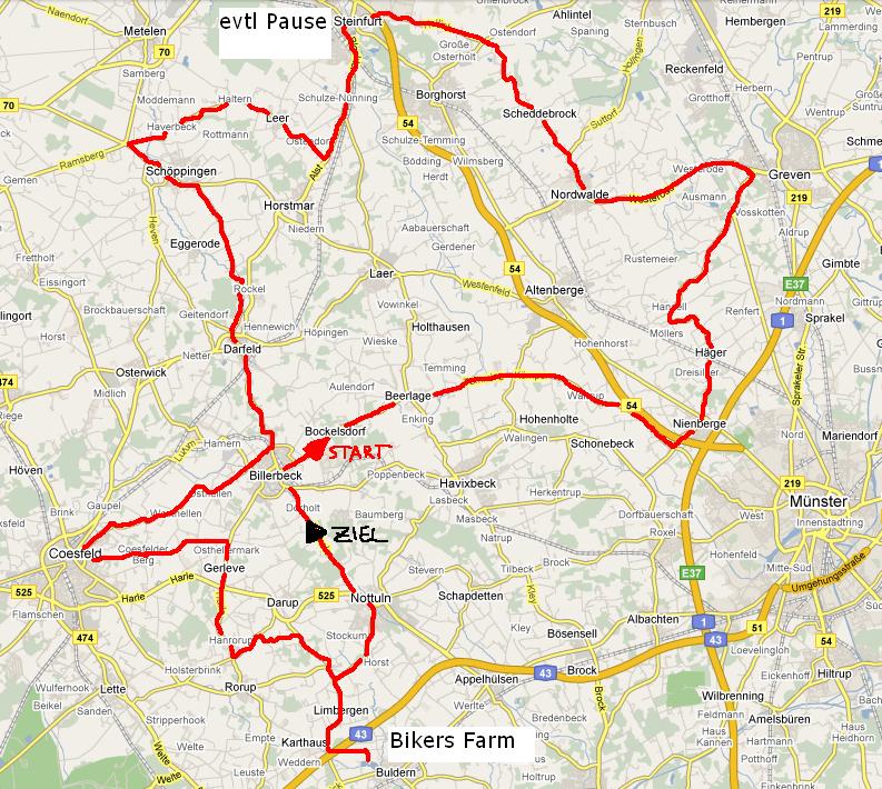 Wir könnten in Billerbeck starten und diese Tour fahren, sollten so ca 130-140km sein, und sind viele nette Kurvenstrecken dabei. -