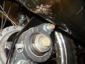An die Radnabe ,wo sonst das Zahnrad mit dem Freilauf für den Pedalantrieb sitzt,wird ein Flansch geschraubt.Statt 6mm sind dort jetzt 8mm Gewinde.Auf den Flansch kommt das Flanschlager,dieses wird an die Strebe zum Motorlager geschraubt. Fertig.Ganz wichtig ist die zweite Strebe zum Unterteil des Motors,damit die Konstruktion nicht verwindet beim "Crossen".Ich werd das ganze nochmal ohne Auspuff fotografieren,damits besser zu sehen ist.Ich mußja eh noch das Prallblech Rauskriegen.