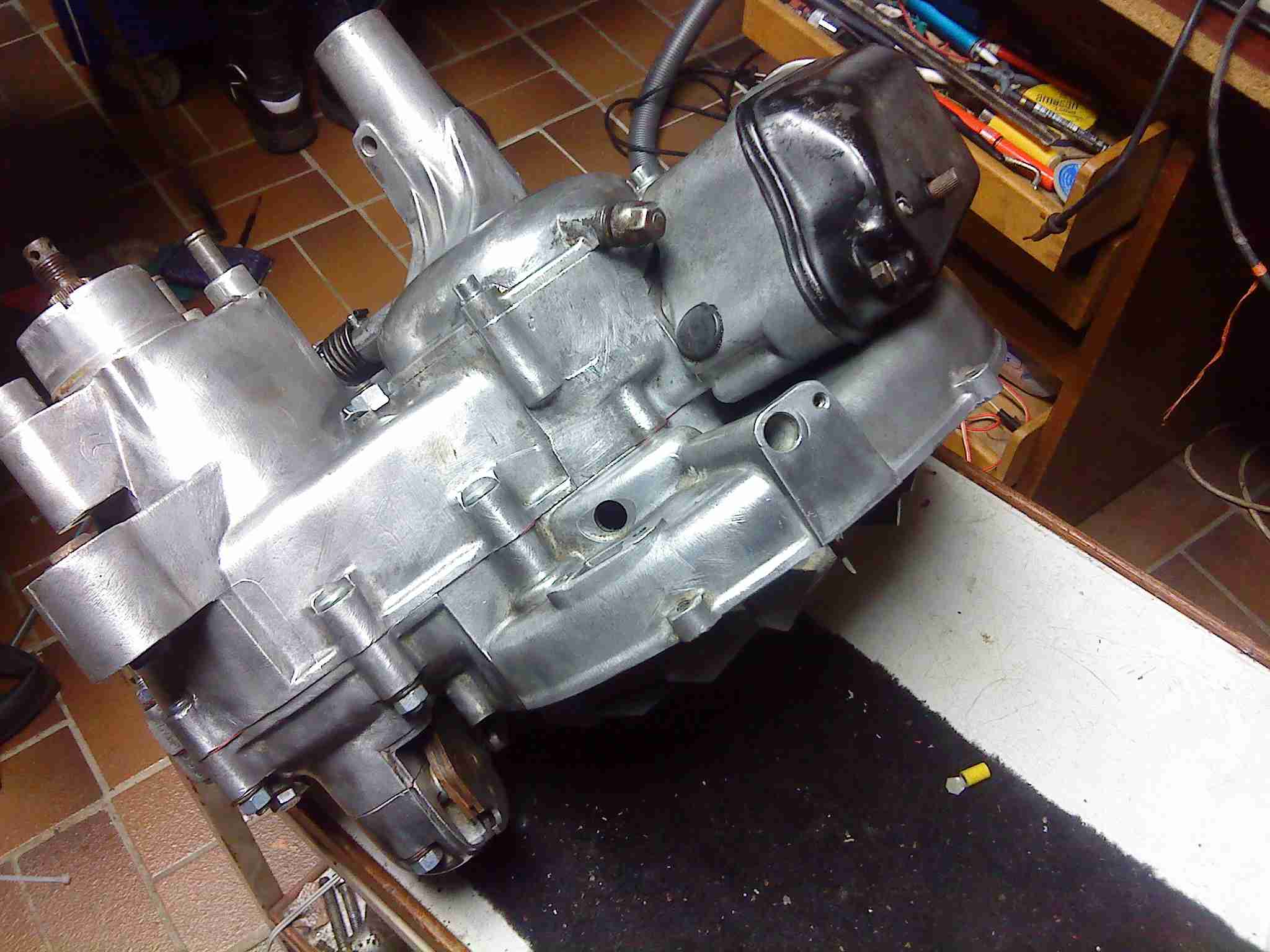Also komplett zerlegt das Ding, Sandgestrahlt bei D&S, neu lackiert, Motor komplett überholt mit neuem Zylinder / Kolben / Kopf.