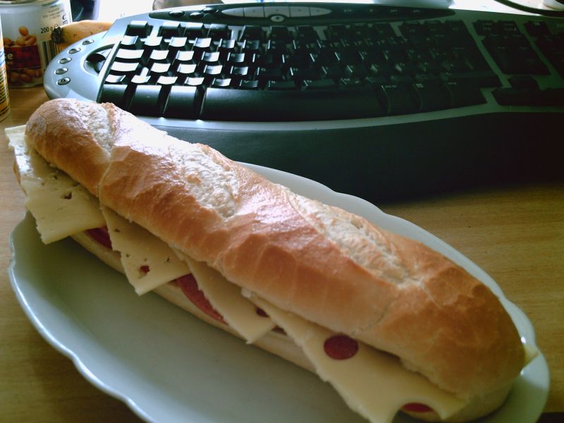 jau heute abend habe ich mir son aufbackbaguette gemacht und mit frischkäse gefüllten peperoni, salami, käse und totmatenscheiben belegt