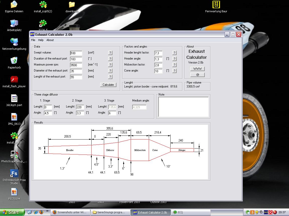die grundmaße würde ich mir errechnen. auf kurz oder lang wirste viel rumprobieren müssen um deinen optimalen auspuff zu finden