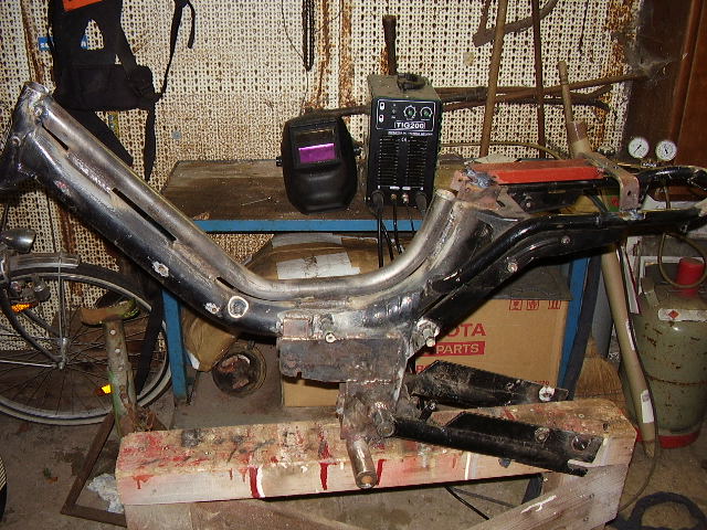 Moin Freunde,bin auch mal wieder etwas aktiv geworden.Meine alte X 50 soll fürs nächste Jahr von nem Automatikmotor gescheucht werden.Das Ganze schwirrte schon lange im Kopf rum,aber nun solls langsam losgehen.Hab zuerst den Rahmen verstärkt und die Motorhalterungen umgebaut.Das Schwingenlager ist dabei ein paar cm nach oben gewandert (neue Hülse gedreht und eingeschweißt).Insgesamt sind 8kg Eisen zusätzlich an den Rahmen gekommen - wir sind aber auch 3 Fahrer über 2Zentner!!!Hier die ersten Bilder