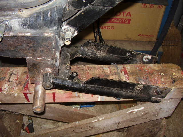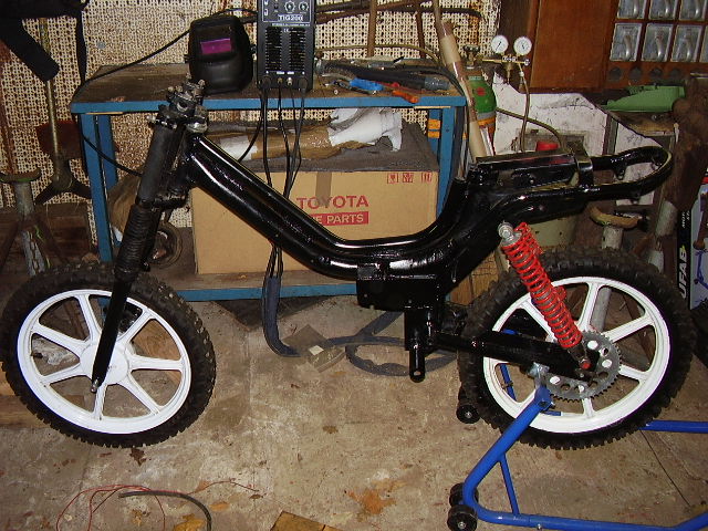 Der Winkel von den Dämpfern ist tatsächlich recht flach,was aber auch gut ist,denn dadurch sind bei einem bestimmten Federweg weniger "Stoßdämpferweg" nötig,was die Federung wiederum weicher macht.Ist tatsächlich auch von mir so auf meine 100kg abgestimmt - durch den Punkt der Schwingenlagerung.Zur Gabel:Die passt nicht so auf Anhieb.Man muß aber nur von der Gabelbrücke die senkrechte Stange um 0,5mm abdrehen und schon passen die original Lagerschalen darüber.Dann muß nur noch das Lenkkopfrohr am Rahmen etwas gekürzt werden und fertig.Wegen dem Vergaser will ich mal sehen,ob bei Ebay was zu kriegen ist.