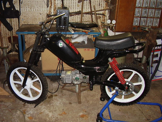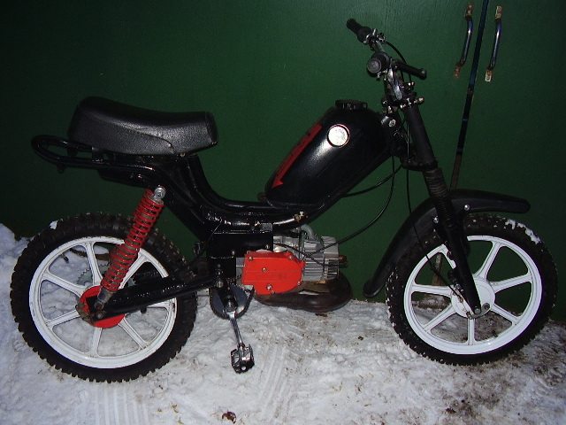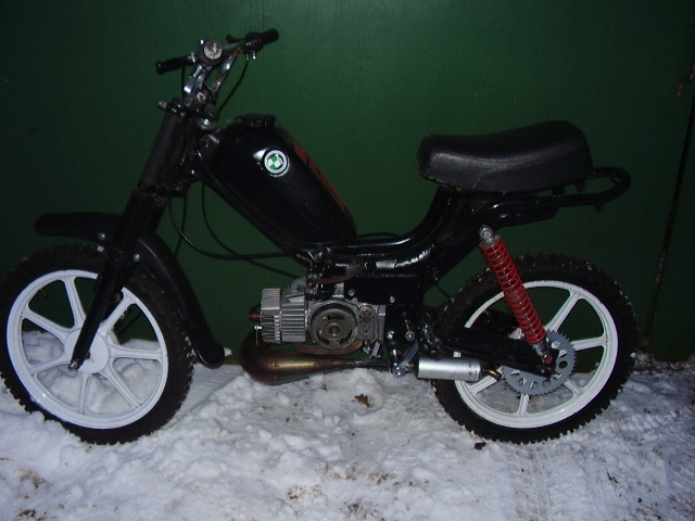 Die Gabel stammt von einer RD 80 Lc und die Federbeine sind von einer Honda XL 185.Sind genial,die Dinger - Gasdruck !Felgen von Prima GT.Jetzt noch ne Frage an die Experten zum Motor.Also der E50 wird bestehen aus:Kstar Welle,Puchshop Tuningkopf,Athena 50ccm Membran und Proma CC Auspuffschnecke.Kontaktzündung bleibt.Was für einen Vergaser würdet ihr mir empfehlen und evtl.andere Membranplättchen??Ich hätte noch einen 16er Dellorto SHA rumliegen,würde der reichen??
