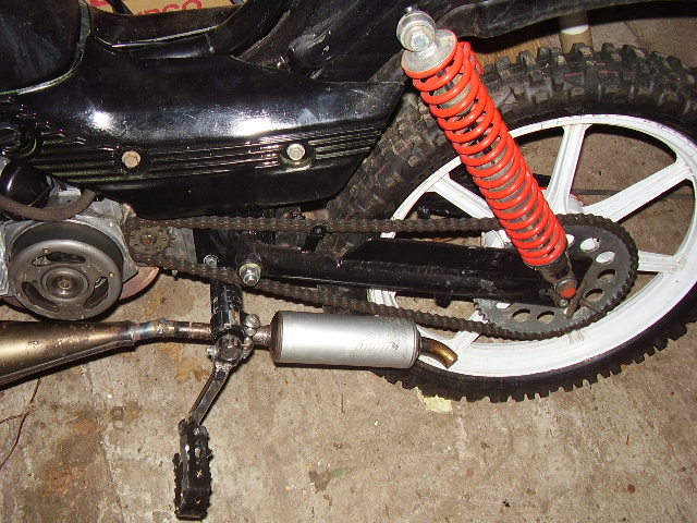 Kettenrad ist ein 50er , ritzel =13er.Ab 13er Ritzel fängt die Kette am unteren Rohr der Pedalachse an zu schleifen,ist aber nur im Stand.Mit Fahrer ,wenn das Moped einfedert gehts bis 16er,wäre aber von der Übersetzung her nicht fahrbar.Zusätzlichen Kettenspanner wird nicht gebraucht,weil Schwingenlager=dicht am Ritzel