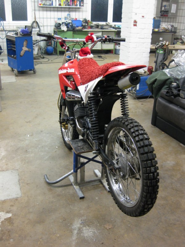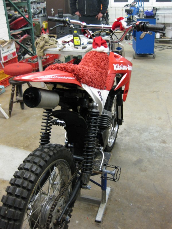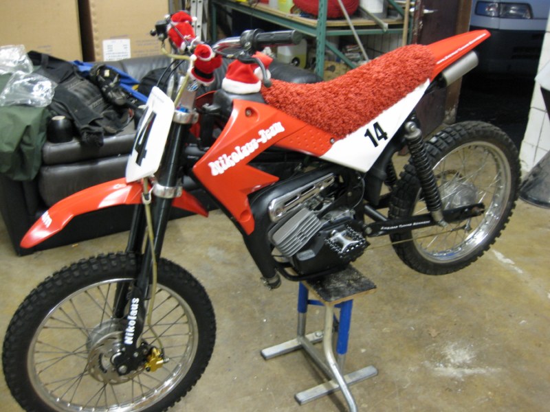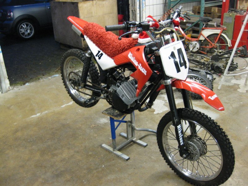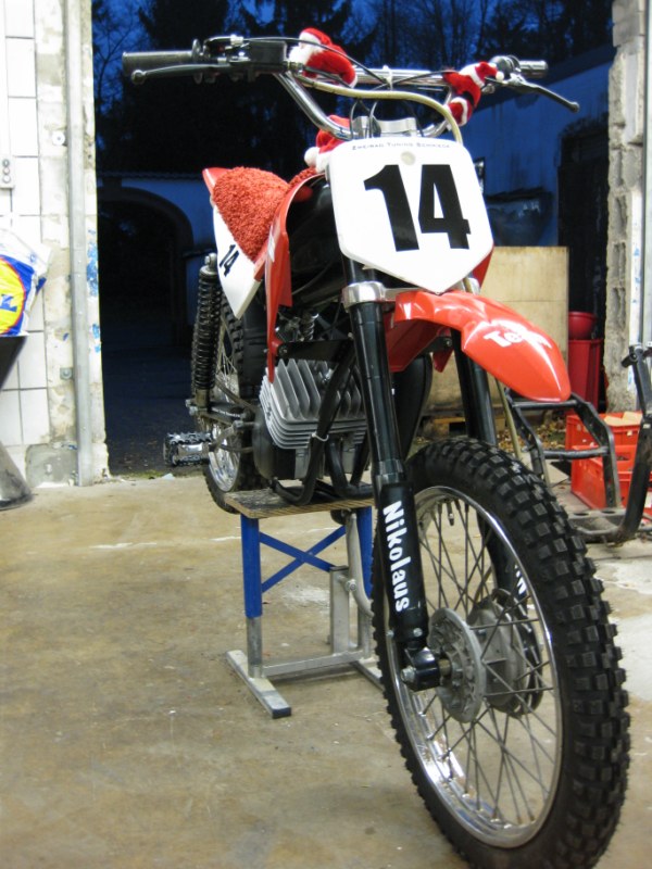Desweiteren wurde eine PVL Zündung ,eine überholte Kurbelwelle, ein 21er Dellorto Vergaser, Modifizierte XE5 Auspuffanlage, Verkleidungssatz vom 125ccm Dirtbike und ein Stück edlem Teppich auf der Sitzbank (für den Nikolaus Style) verbaut.
