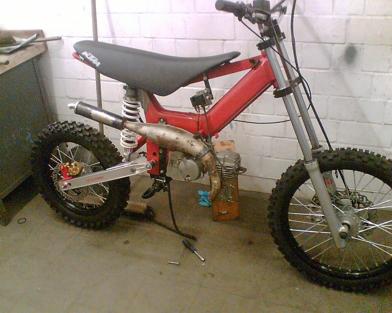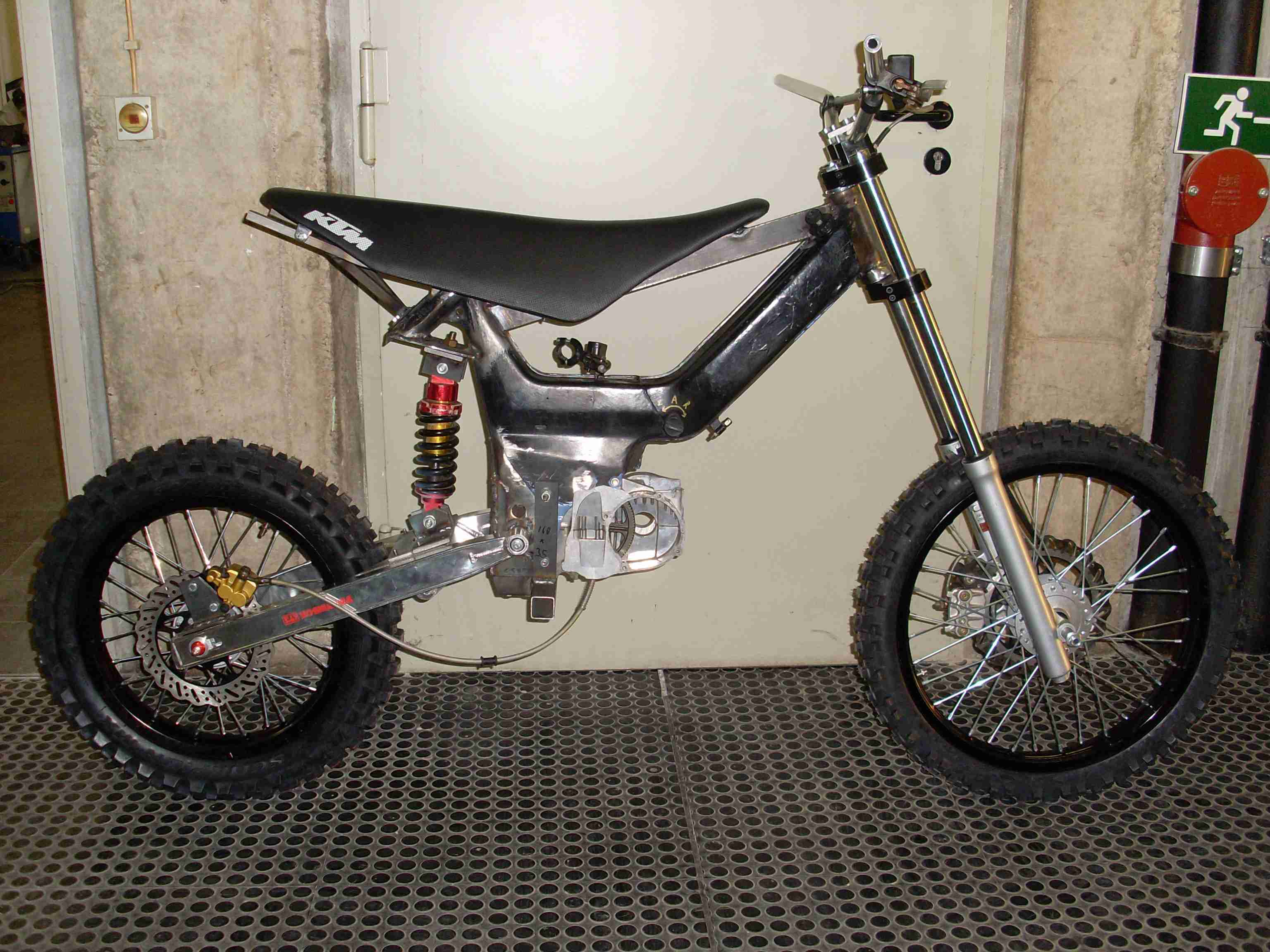 Den Rahmen hab ich praktisch geschenkt bekommen- ohne Motor, aber mit Rädern drin. Die sind für 30€ wieder weiterverkauft worden- somit war der praktisch für 0€. Hulk hat unzählige Besuche bei seinem Supermotodealer gehabt, um dann schlußendlich ein altes WP-Ferderbein einer KTM zu bekommen- ebfalls für Lau, die er aber wohl mit unzähligen Arbeitsstunden für seinen Dealer bezahlt hat..