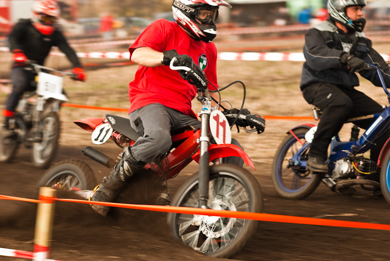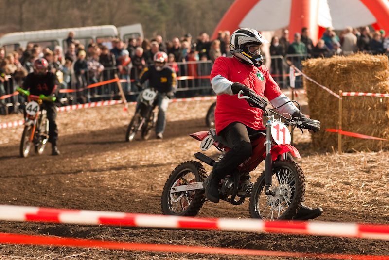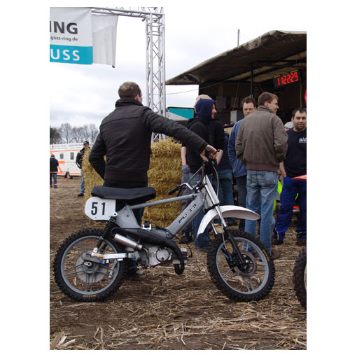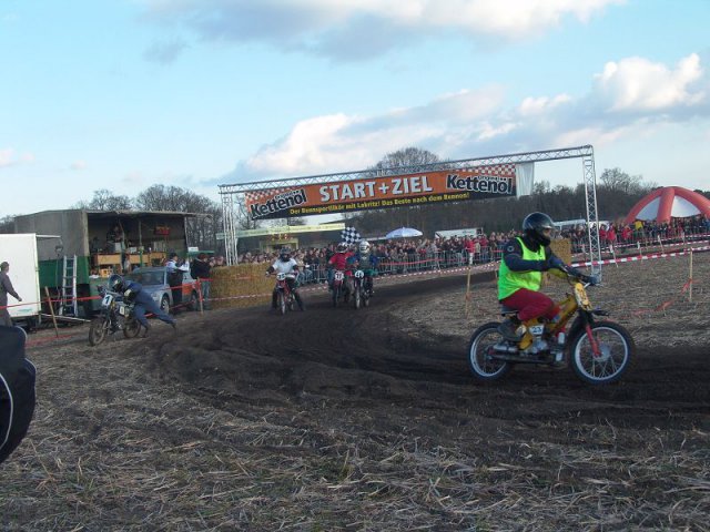 Dann der Start- in der ersten Runde rutscht beim anbremsen der 180°-Start-Zielkurve Mark das Hinterrad weg- die Kolbenfresser legen sich genau HINTER der kurve und in gleicher Runde noch 2x- Fazit- keinen Platz verloren, alles gut. Das Rennen lief ohne weitere Komplikationen für uns, mit einigen Führungswechseln um uns und Team HJT- alles Profifaher mit einem ebenfalls sehr gut vorbereiteten Chassis und einem Spezialmotor: Zylinder+Kopf aus dem vollen gefräst, mit Einsatz einer Stahllaufbuchse und Gebläsekühlung. Highlight an der Puch: 2 Ketten-system, eines vom Ritzel zur Schwingenachse auf ein Doppelritzel und dann von da zum Hinterrad. Etwa 1h vor schluß hatte dann HJT probleme mit der Kette / Führung, was ihnen dann zum Ende 15 Runden Rückstand bescherte- hätte bei ihnen aber eh nicht gepasst, da wir zum Ende einen Tankstopp weniger hatten. Und das war ein Thema: immer nur ein Mofa an der Tanke, schön der Reihe nach! Joa, und am Ende der Sieg für uns, und Ottemeier mit Platz 2 nur 2 Runden hinter uns...
