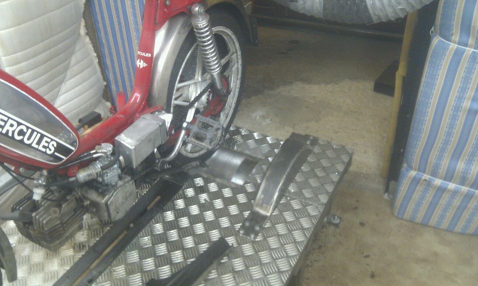 Ja, die kommen auf das Stück, das rechts noch raus steht. Der Prüfstand läuft aber noch nicht. Diese Woche erst mal einen Schraubstock auf den Vorderradhalter gesetzt, weil die Mofas immer umfielen und das Spannen schwierig war. Jetzt müsste es einfach gehen und sicher halten. Jetzt muss erst noch ein Schutzgehäuse für die Schwungscheiben bzw. für die Leute, die sich im Bereich der Schwungscheiben aufhalten gemacht werden und die Bremse wird pneumatisch gemacht mit einer Zange, sodass die Bremsbeläge ganz abheben.