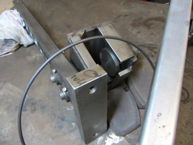 Der ganze Prüfstand besteht also jetzt aus einem Rohr mit Deckeln angeschweißt durch das eine 50er Welle durch gesteckt ist und auf der Welle, die mit 2 Bocklagern unter dem Rahmen befestigt ist sitzt noch ein Drittes Bocklager an das der Bremshebel angeflanscht ist. Am bremshebel wiederum ist über Bolzen beweglich der geschweißte bremssattel befestigt. Im Abstand von 716mm drückt der Bremshebel mittels einer Schraube M6 auf eine Paketplattformwaage. Die Vorlast des Bremshebel auf die Waage wird mit einer Feder erzeugt. Ich hoffe man kann sich das ungefär vorstellen.