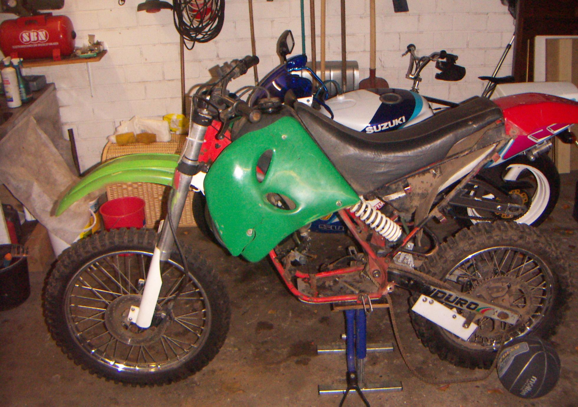 Doppelkühler, Crossreifen, Scheibenbremse vorne/hinten, Upside Down Gabel vorne, Federbein hinten (fehlt zur Zeit).