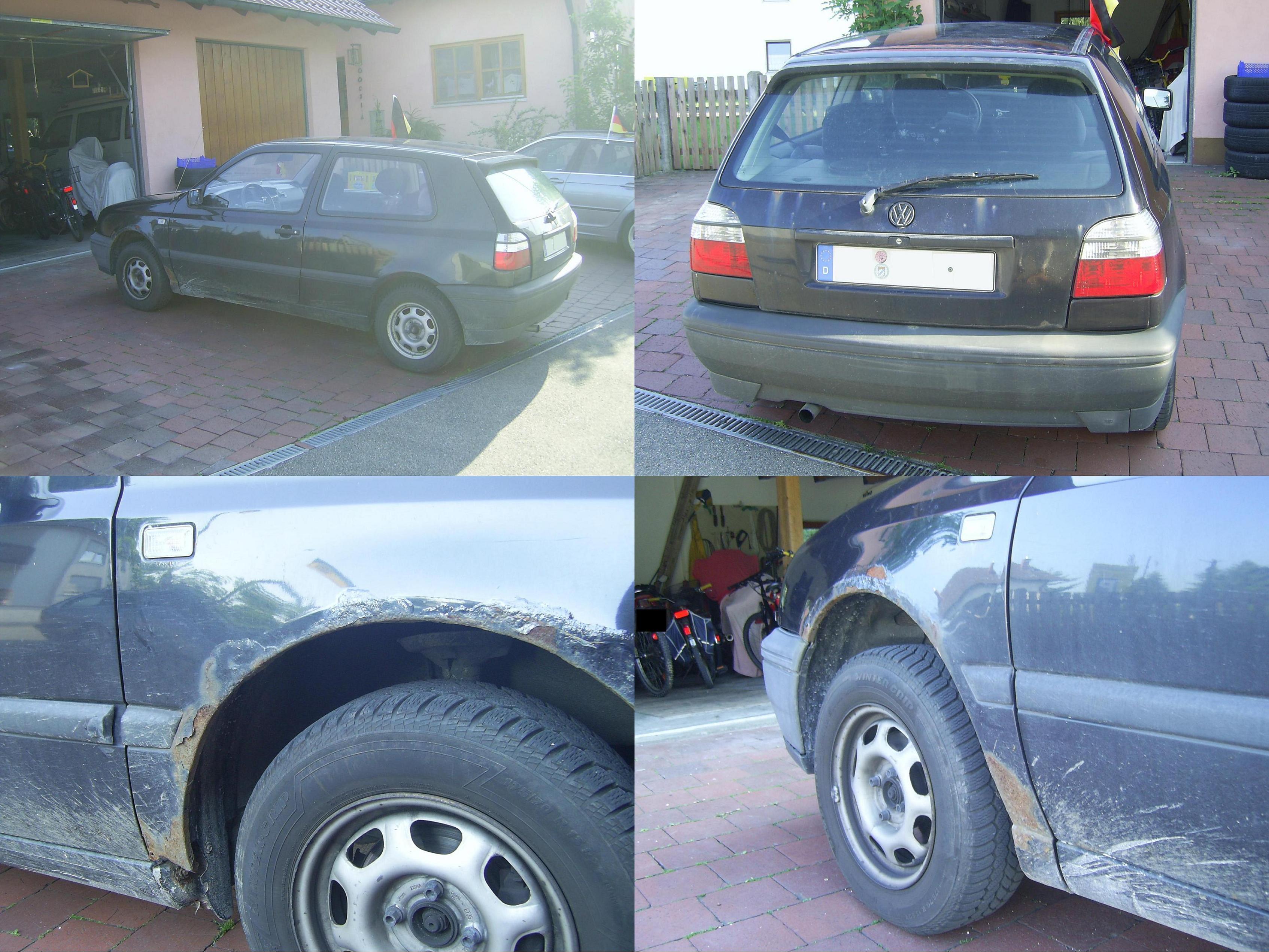 Läuft und hat TÜV/AU bis Juni 2011. Dann bekommt er mit bissl Schweißen (Kotflügel!!!) auch normal nochmal TÜV. Bremsen und ABS hats mal Probleme gegeben, funktioniert aber meines Wissens jetzt. Austauschheckklappe ist montiert und evtl gelegentlich undicht. Anlasser macht Geräusche (aber schon seit langem :) und der Motor hört sich auch schon etwas "gebraucht" an, hat halt etwas Nebengeräusche. Wurde viel bzw. fast nur Kurzstrecke gefahren.