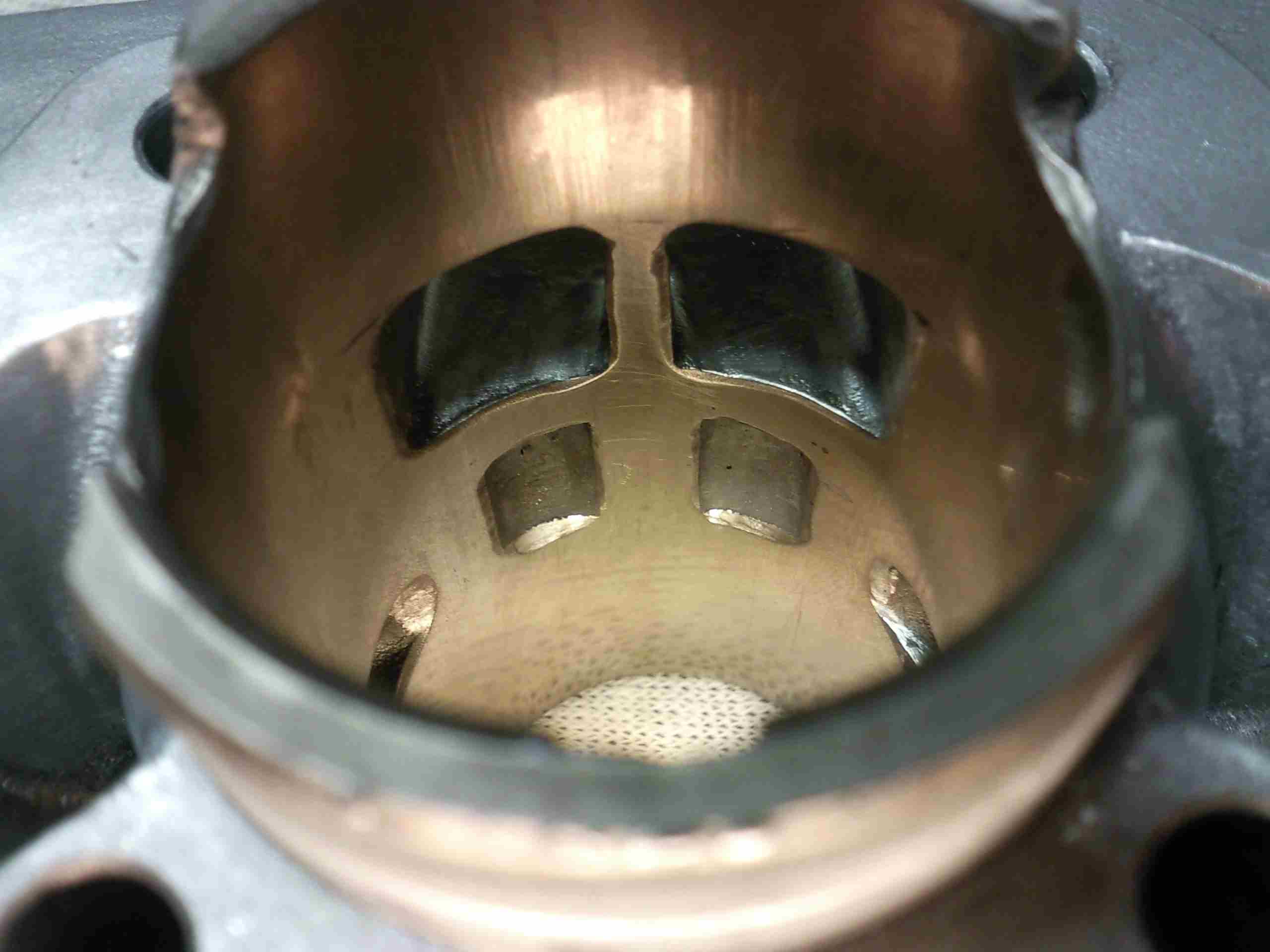Alles etwas suboptimal- keine getrennt geführten ÜS-Kanäle- sondern leider nur 2 große Löcher, Stützer zeigen direkt 90° in den Auslaß, Kanäle am Zylinderfuß sehr klein, Auslaß ohne Steg, ÜS / Auslaß machen mit der Oridichtung nicht voll auf. Also da gibts sicherlich noch Optimierungsbedarf, bis man sich da an die Auspuffanlage traut...