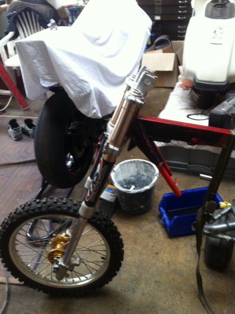 Als erstes habe ich eine neue Gabel eingebaut(KX 80) habe dafür Buchsen gedreht damit die Kegellager reingehen.