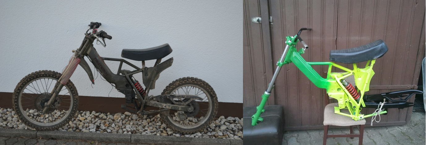 Doch beim Rennen am kommenden Samstag wollen wir einiges besser machen, darum hab ich schon ein abgeänderten Rahmen von einer Puch Maxi gekauft. Danach noch ein E50 Motor der eigentlich komplett hinüber war ( Kupplung total verzogen und Lagerschaden der Welle), also haben wir Angefangen den aufzuarbeiten.