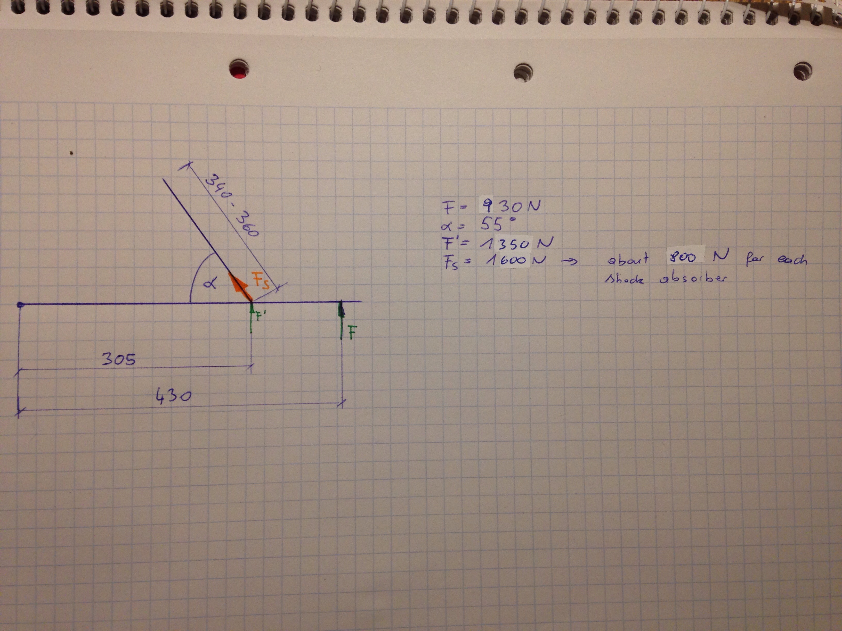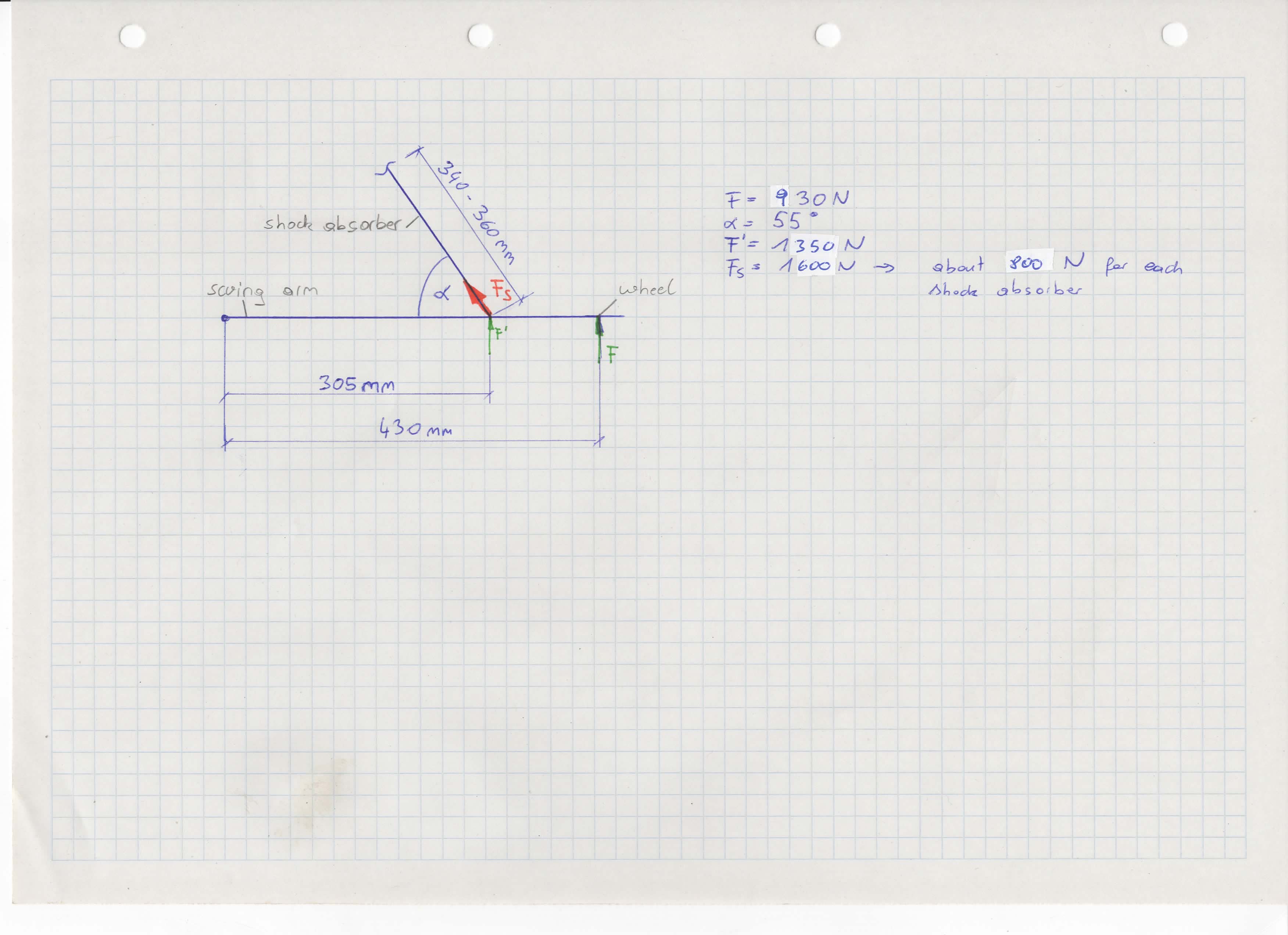 So mit einer Radlast von 930N kommt wie du gesgat hast 1600N Stoßdämpferlast raus also 800 pro Dämpfer.