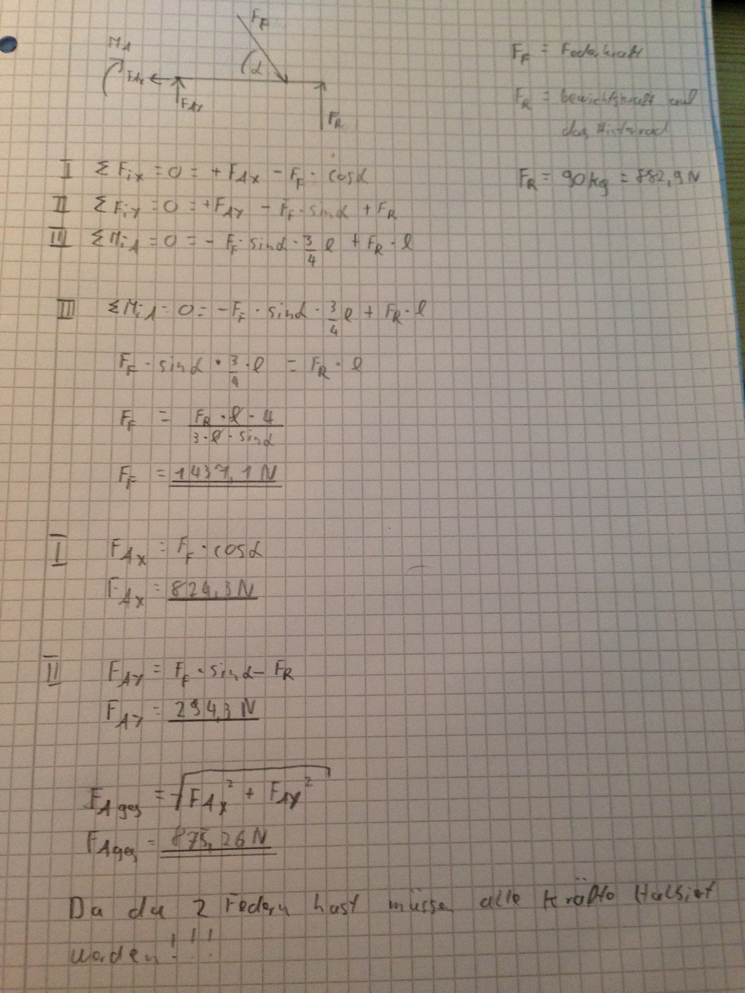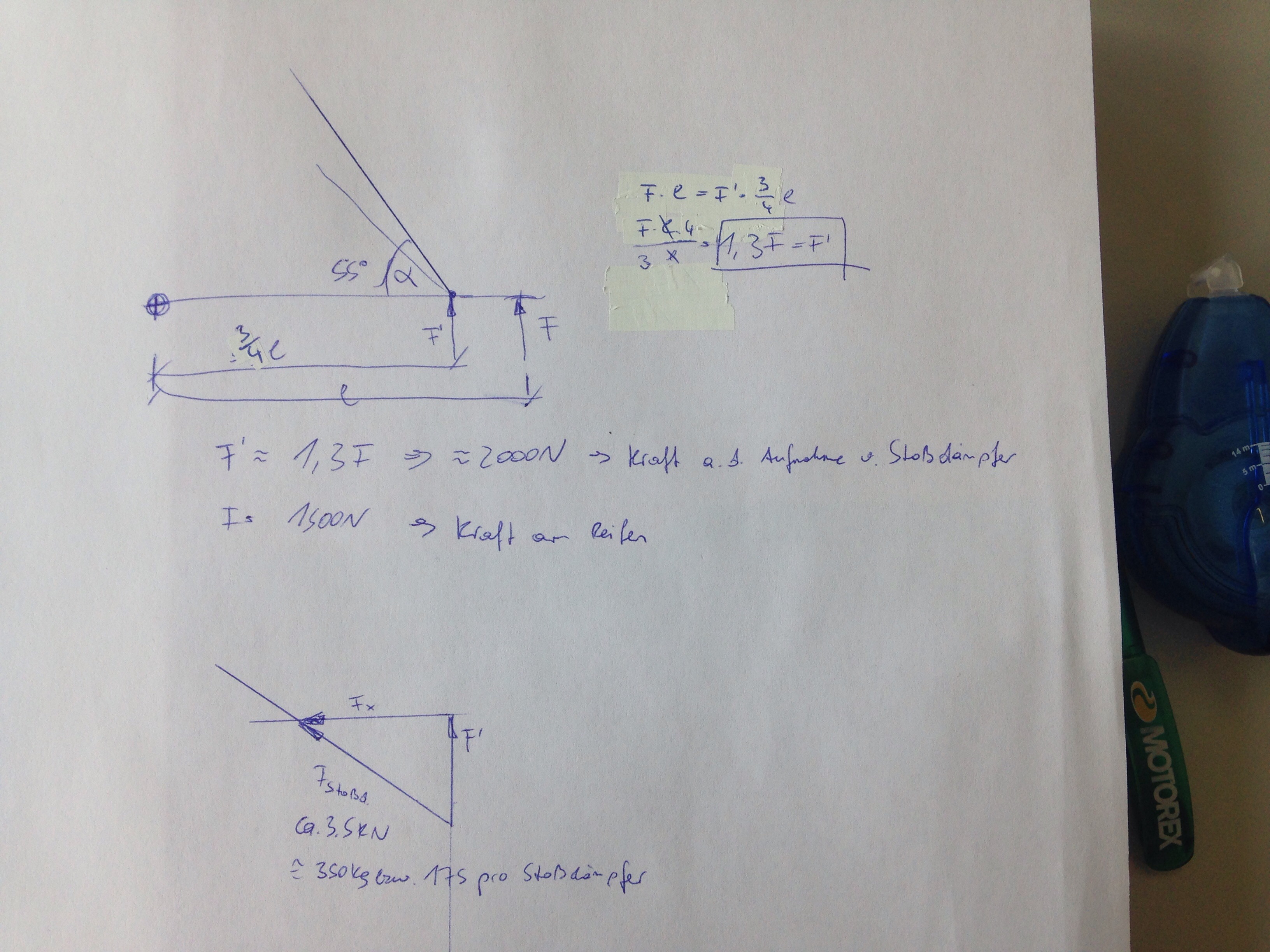 Ja die Kraft am Hinterrad hab ich mit 1500N angenommen und die Kraft im Punkt der Aufnahme mit dem Hebelgesetz auf 1,3 mal Kraft am Hinterrad, sprich ca. 2000N und durch den Winkel hab ich dann 3500N auf den Stoßdämpfern(Kräftedreieck)
