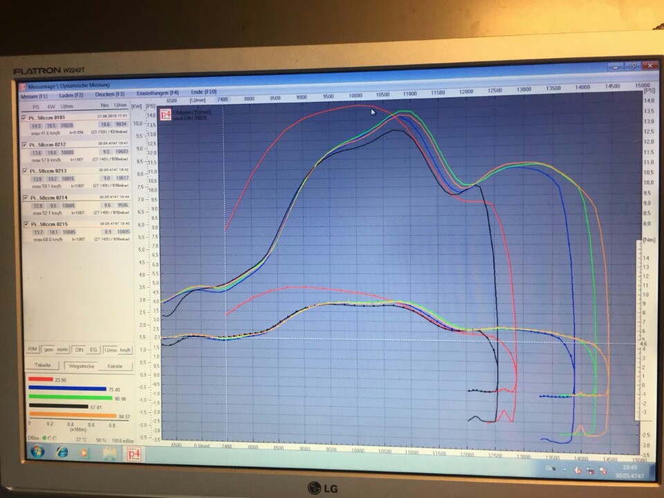 Damit das Forum nicht einschläft mal wieder ein paar Neuigkeiten. Karre ist soweit fertig für Bohnhorst. Gestern dann mal mit dem SX Umbau auf der Rolle gewesen und ein leicht ernüchterndes Ergebniss abgeholt. Nach dem Diagramm zufolge läuft der alte Metrakit (Rote Kurve) um Welten eleganter mit einem heftigen Antritt von über 10 NM und 14,2PS bei unter 10k. Der SX hingegen hinkt da weit hinterher obwohl es sich gefühlt um 5PS mehr handeln könnte. Denke das wird meine Winteraufgabe das fiese Resoloch weg zubügeln. Ein passender Pott muss ran und etwas mit der Einlassreso rumexperimentieren. Ein weiterer Grund könnte auch mein 5Kanal Einlass sein,das muss ich herausfinden,ob sich da irgendwas gegenseitig schadet. Aber immerhin für p&p raufgesteckt mit nem Pott für einen anderen Zylinder gar nicht so schlecht. Zumindest eine ausbaufähige Basis. Und ordentlich rasieren kann man mit dem Ding,zumindest das was das Fahrwerk hergibt.