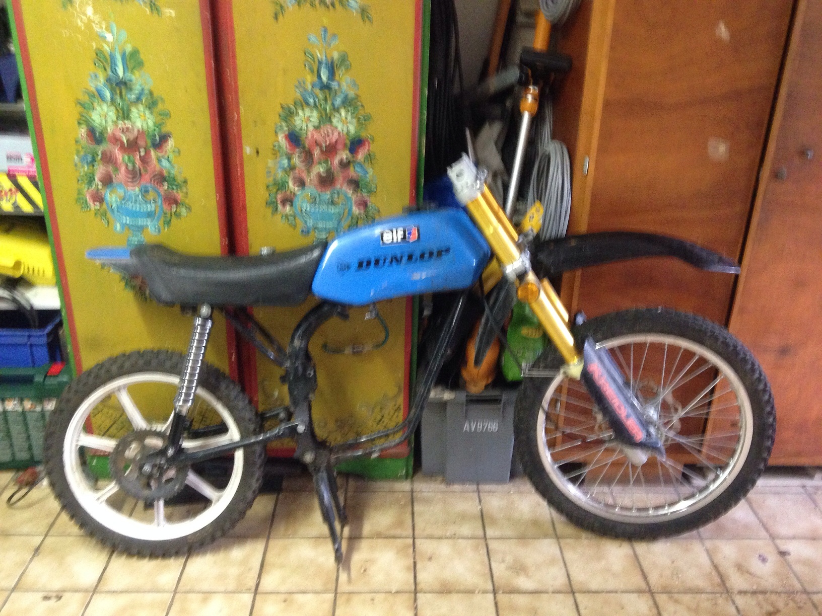 beiden abgetrennt und das der Kreidler an den GT Rahmen geschweisst. Jetzt war sie vorne zu hoch. Also längere Federbeine, die uns in Kell das Kreuz