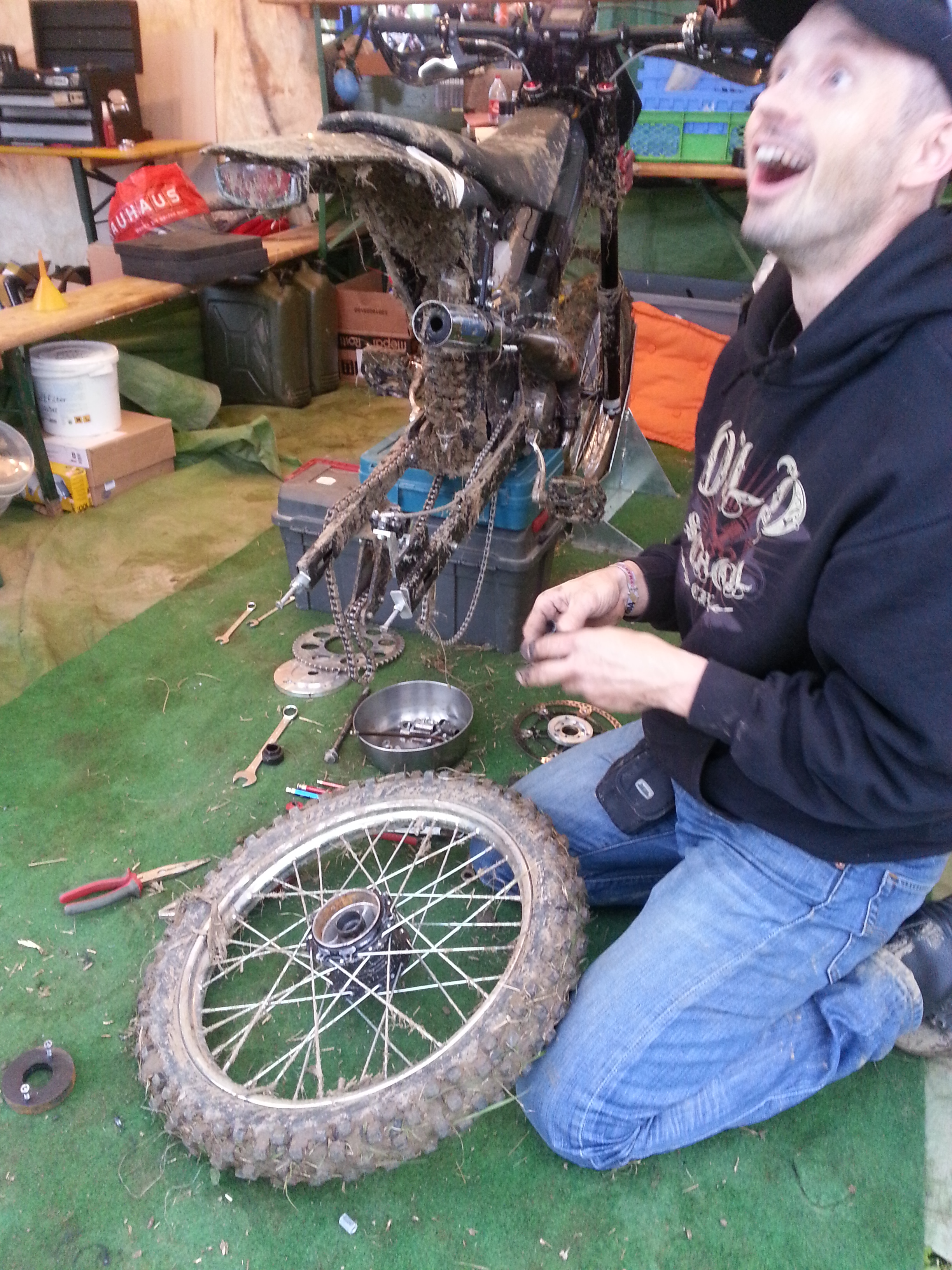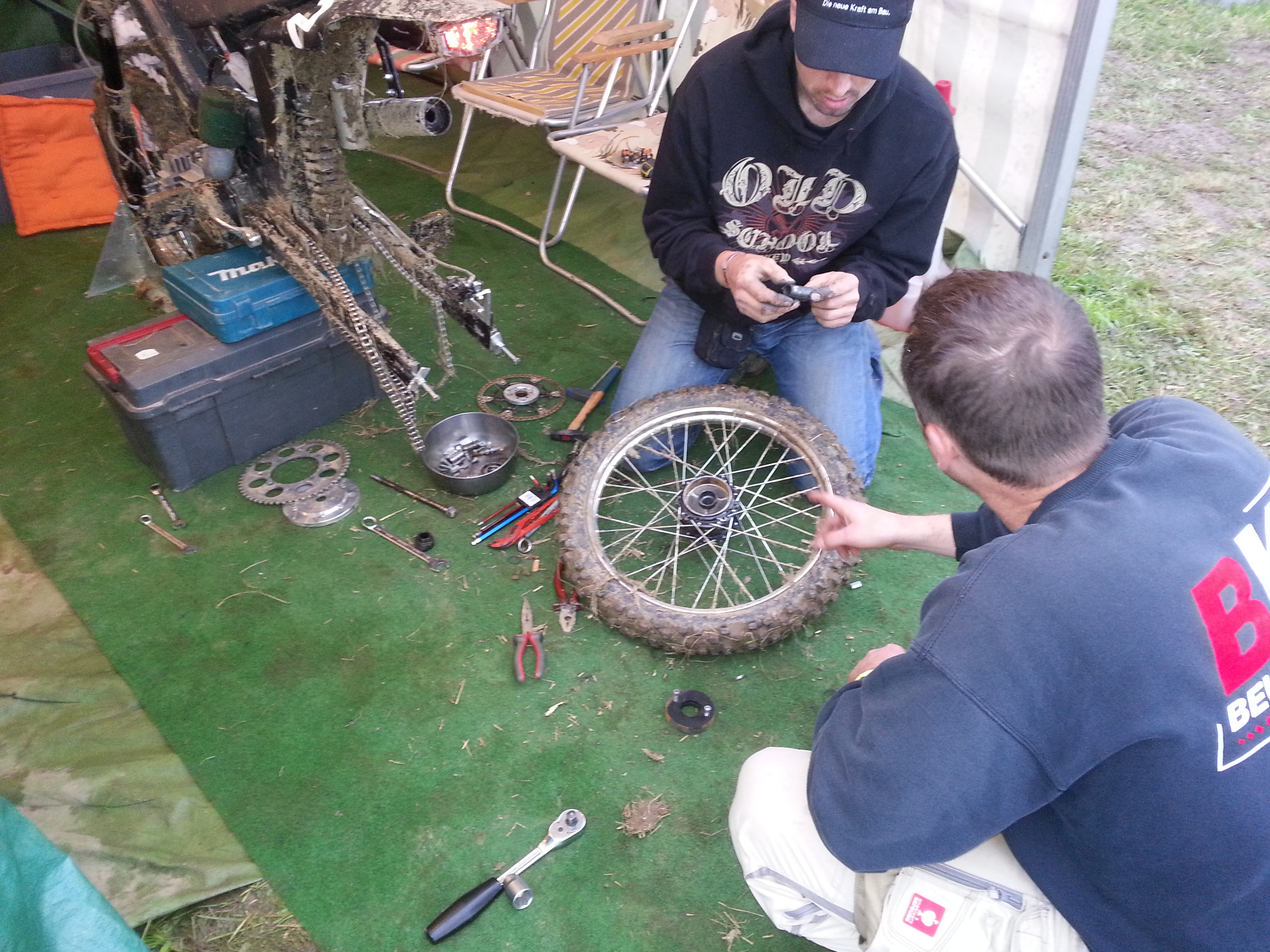 die Party gegangen... ...tja, irgendwann fing unser Silvio dann an das Hinterrad auszubauen und zu demontieren... er fummelte die Lager aus der Narbe und säuberte alles... von den vier (!) Lagern waren drei zerstört... das letzte war noch halbwegs gängig... es fehlte jetzt also noch ein zweites, um die Narbe wieder provisorisch zusammen zu fummeln... ich hab mich dann bei allen Teams durchgefragt, ob irgendjemand ein passendes Lager dabei hätte... nach 40 Teams wurde ich fündig... es hatte tatsächlich jemand ein