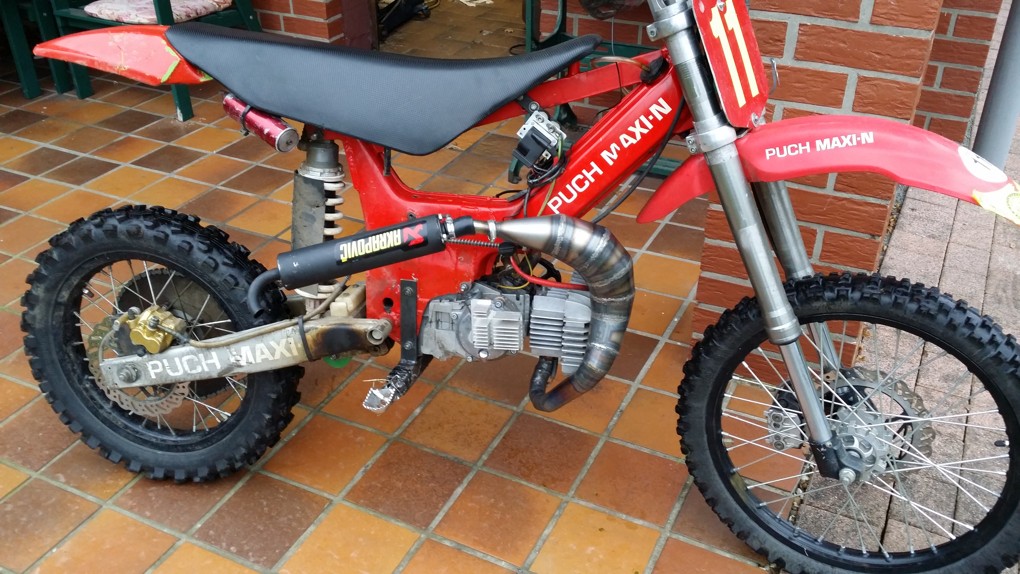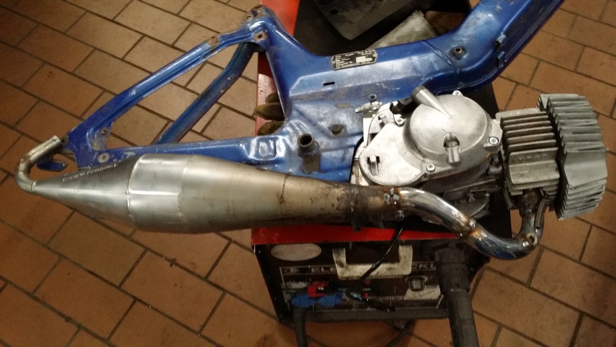 Der Auspuff scheint auch vom Resonazvolumen her gut zu passen... zumindest sieht es vom Foto her so aus... die meisten Roller- oder SX-Pötte sind meiner Meinung nach zu groß... genauso wie der 'Schrottauspuff' oben auf dem Foto... manchmal ist weniger eben mehr!...