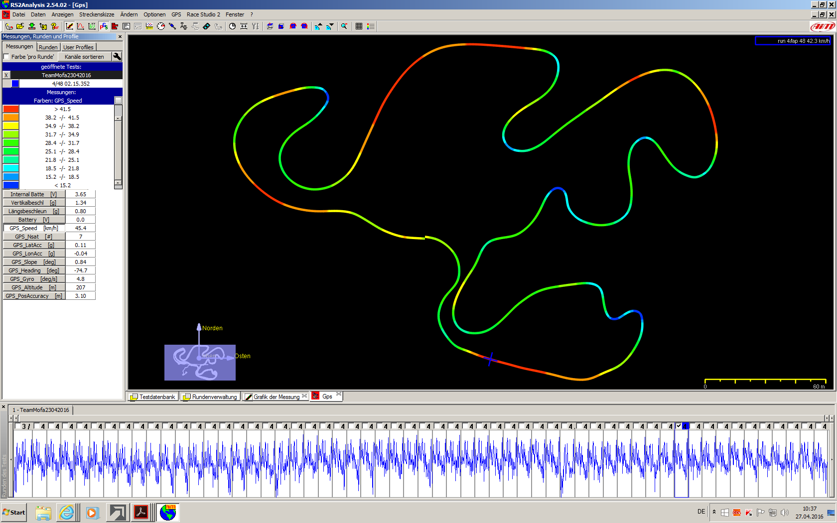 Das ist einen Laptimer und Datenlogger... ursprünglich hab ich den fürs Kart gekauft... da hat er mir auch gute Dienste geleistet... das Ding läuft über eine GPS-Ortung und Beschleunigungssensoren... damit kannst du quasi unabhängig von der Zeitnahme (oder wenn keine Zeitnahme vorhanden) deine eigenen Rundenzeiten ermitteln... mit der entsprechenden Software Race Studio 2 (kostenlos) kannst du dann hinterher deine Daten auslesen und auswerten... die Grund-Software wird übrigens auch im 'großen' Motorsport benutzt... jedoch muss man sich schon sehr lange damit beschäftigen bis man damit sinnvoll umgehen kann... ...ich muss sagen, im Mofabereich ist das aber nur bedingt möglich/sinnvoll mit der Datenauswertung...
