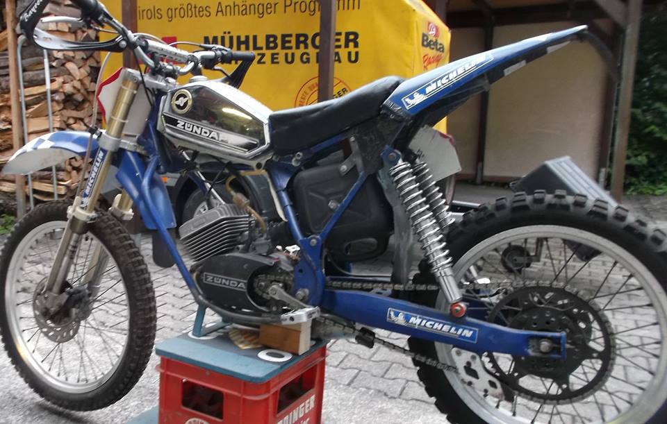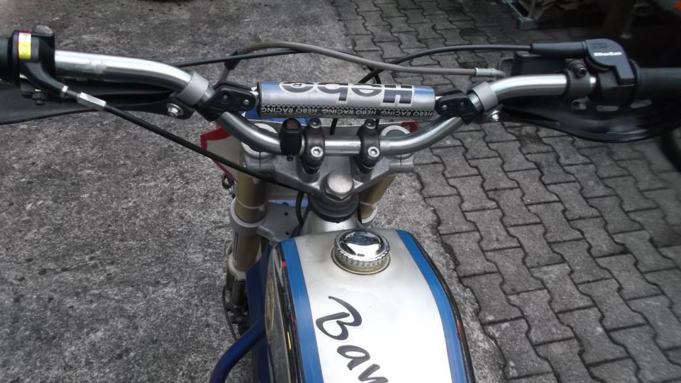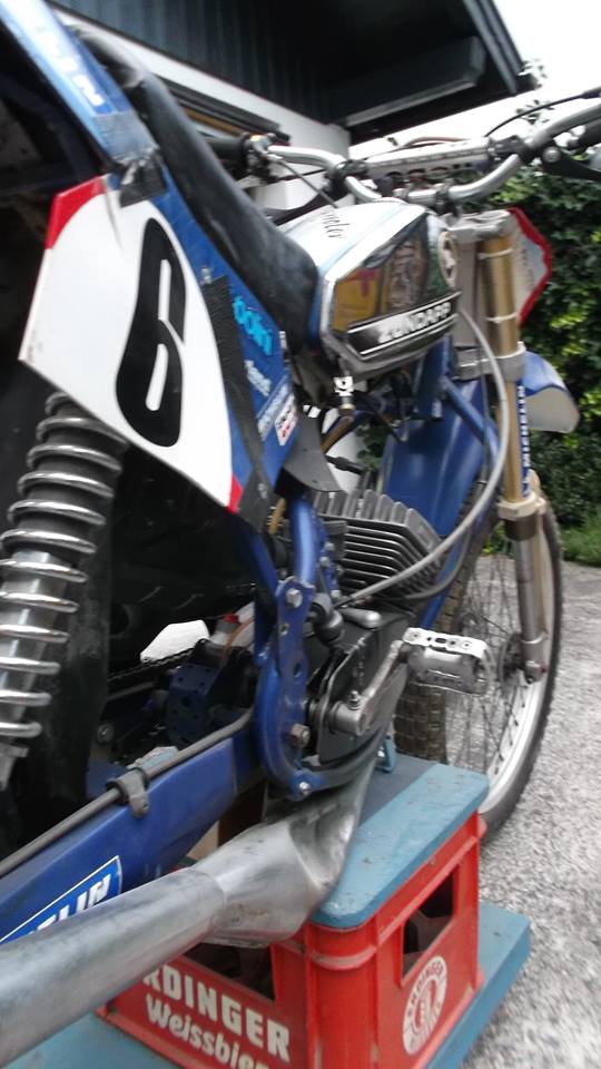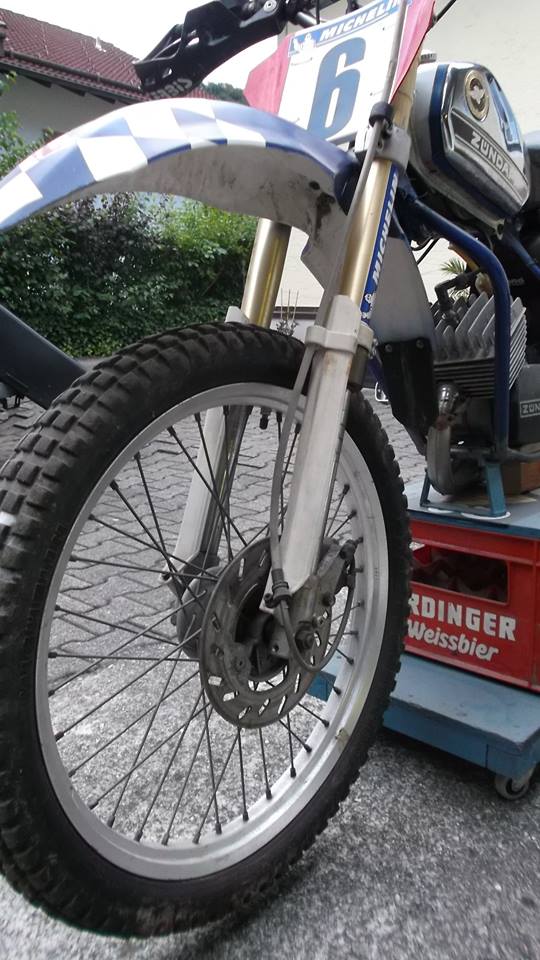 Es handelt sich um einen kompletten Derbi Senda Rahmen. Laut Vorbesitzer wurde das hintere Fahrwerk auf 2 Federbeine umgebaut, weil es das Reglement so verlangt hat.