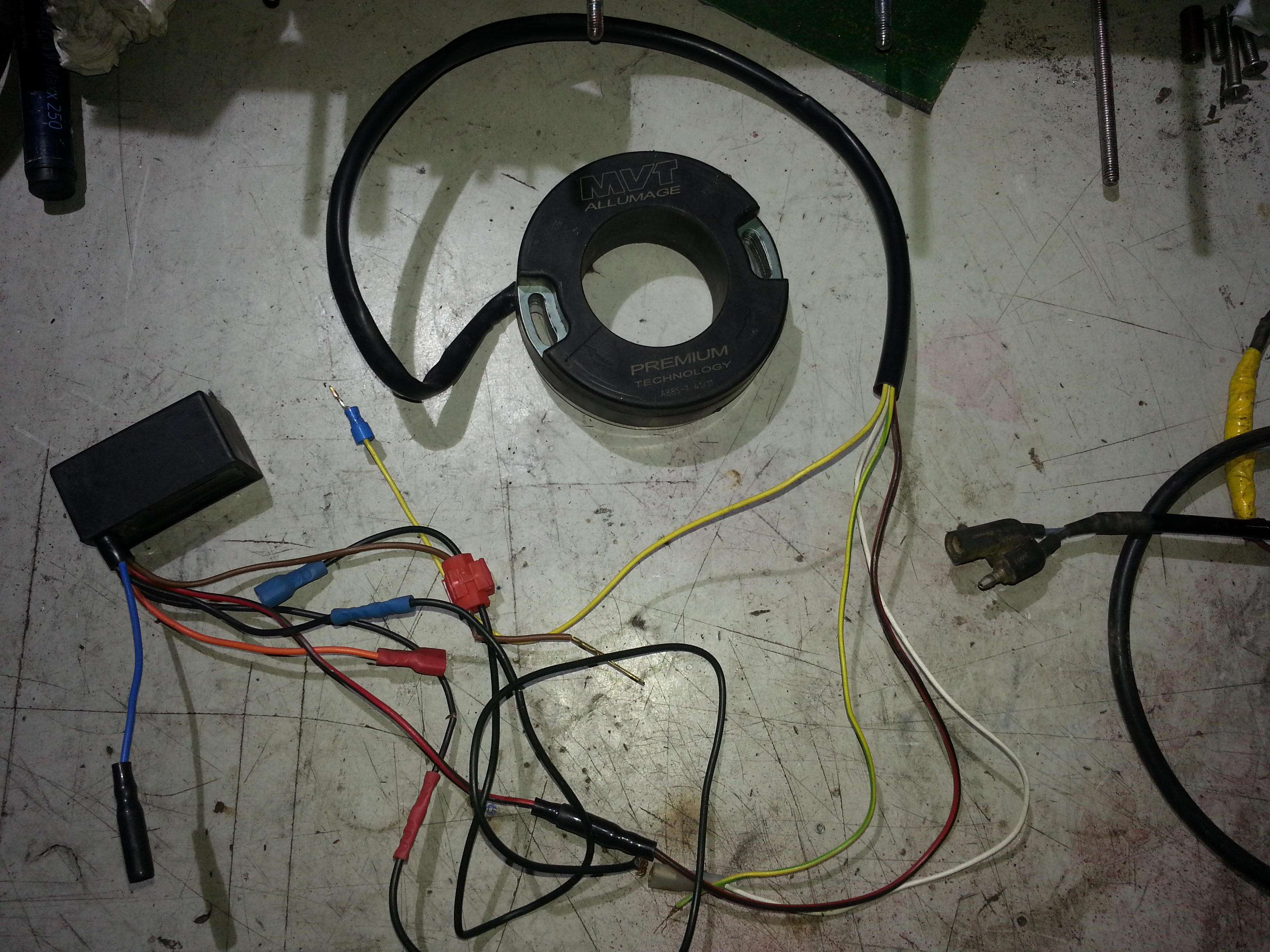 ich versuche gerade eine Mvt Zündung für meine Px fit zu machen. Die Zündanlage habe ich vor geraumer Zeit mal in der Kleinanzeigen Bucht für nen Zwacken erstanden. Sie war an einem Peugeot Plaste-Bomber montiert den die gute Frau Besitzerin wieder auf Originalzustand zurück basteln wollte. Leider kam es für die Dame nicht in Frage die Zündspule herauszurücken, da sie denn ja selber keine mehr hat...