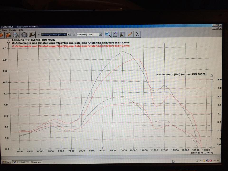 Anbei noch ein Prüfdiagramm. Rot und Grün sind die Kurven mit Ansaugtrichter auf dem Vergaser, der in dem Schlauch zum Luftfilter sitzt. Schwarz und blau sind ohne Filter... Habe sowas auch noch nicht erlebt.