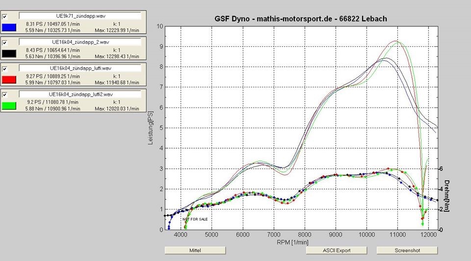 Anbei noch ein Prüfdiagramm. Rot und Grün sind die Kurven mit Ansaugtrichter auf dem Vergaser, der in dem Schlauch zum Luftfilter sitzt. Schwarz und blau sind ohne Filter... Habe sowas auch noch nicht erlebt.