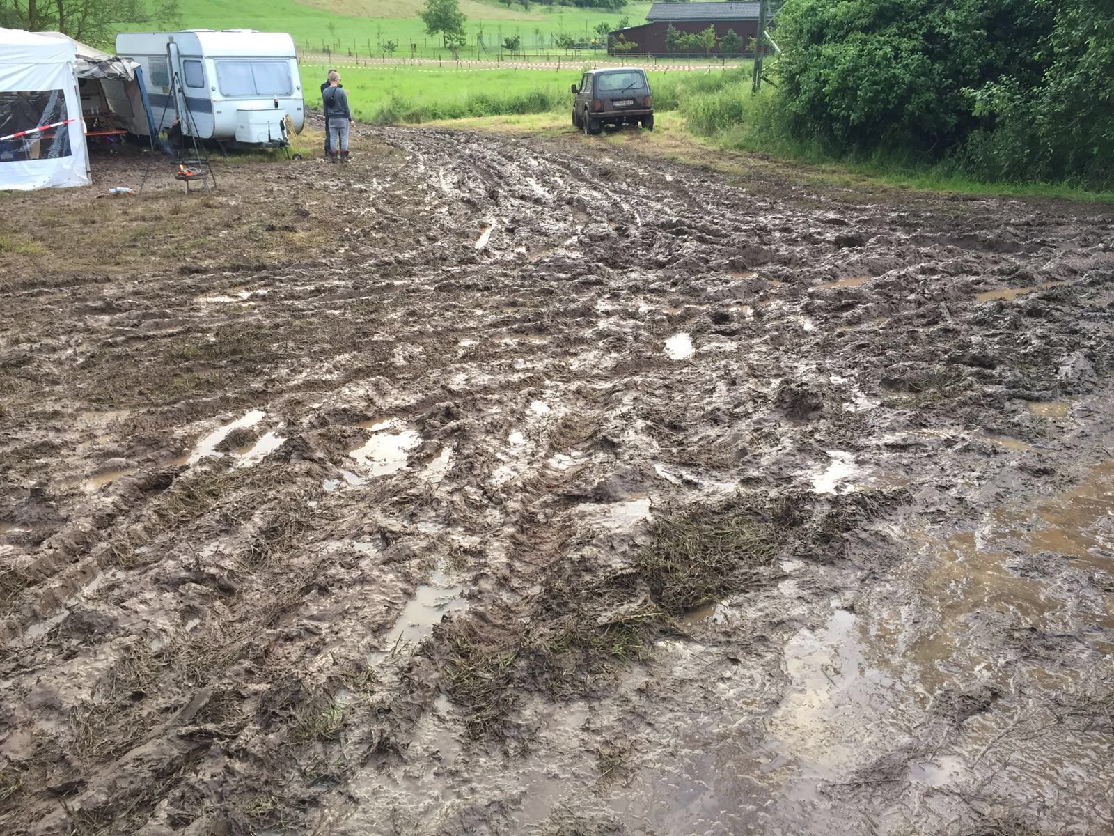 Freitags war die Wiese mit einem Allradfahrzeug wenigstens noch einigermaßen befahrbar.