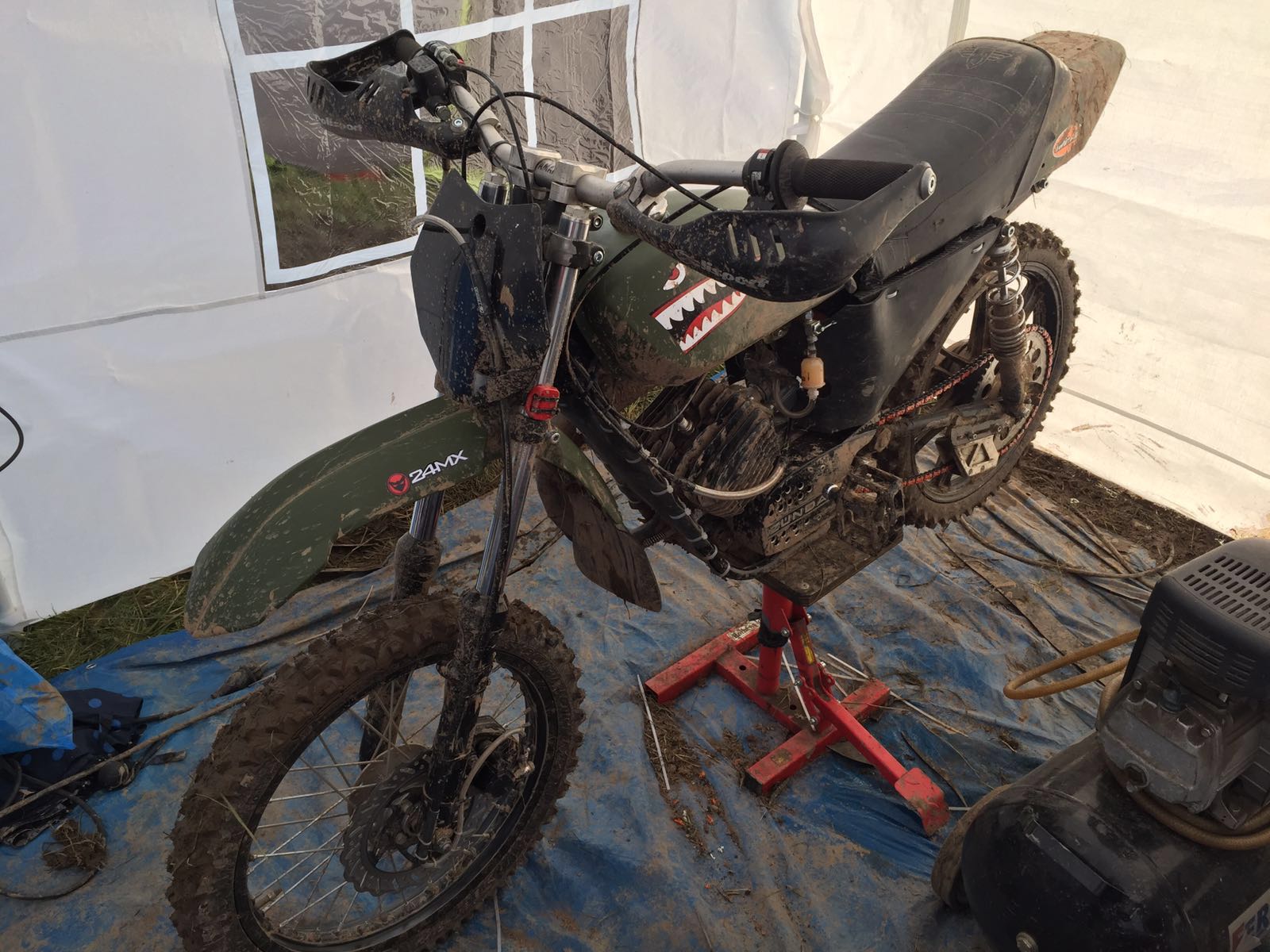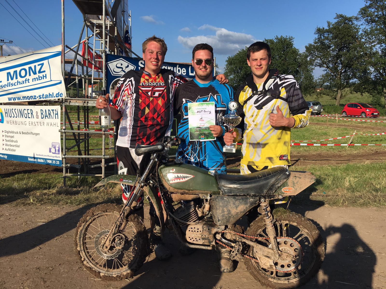 Wir befreiten unsere Karre anschließend einigermaßen von dem Schlamm und meine Teamkollegen bauten einen provisorischen Luftfilterkasten und einen Spritzschutz für den Zylinder aus Gummimatten.