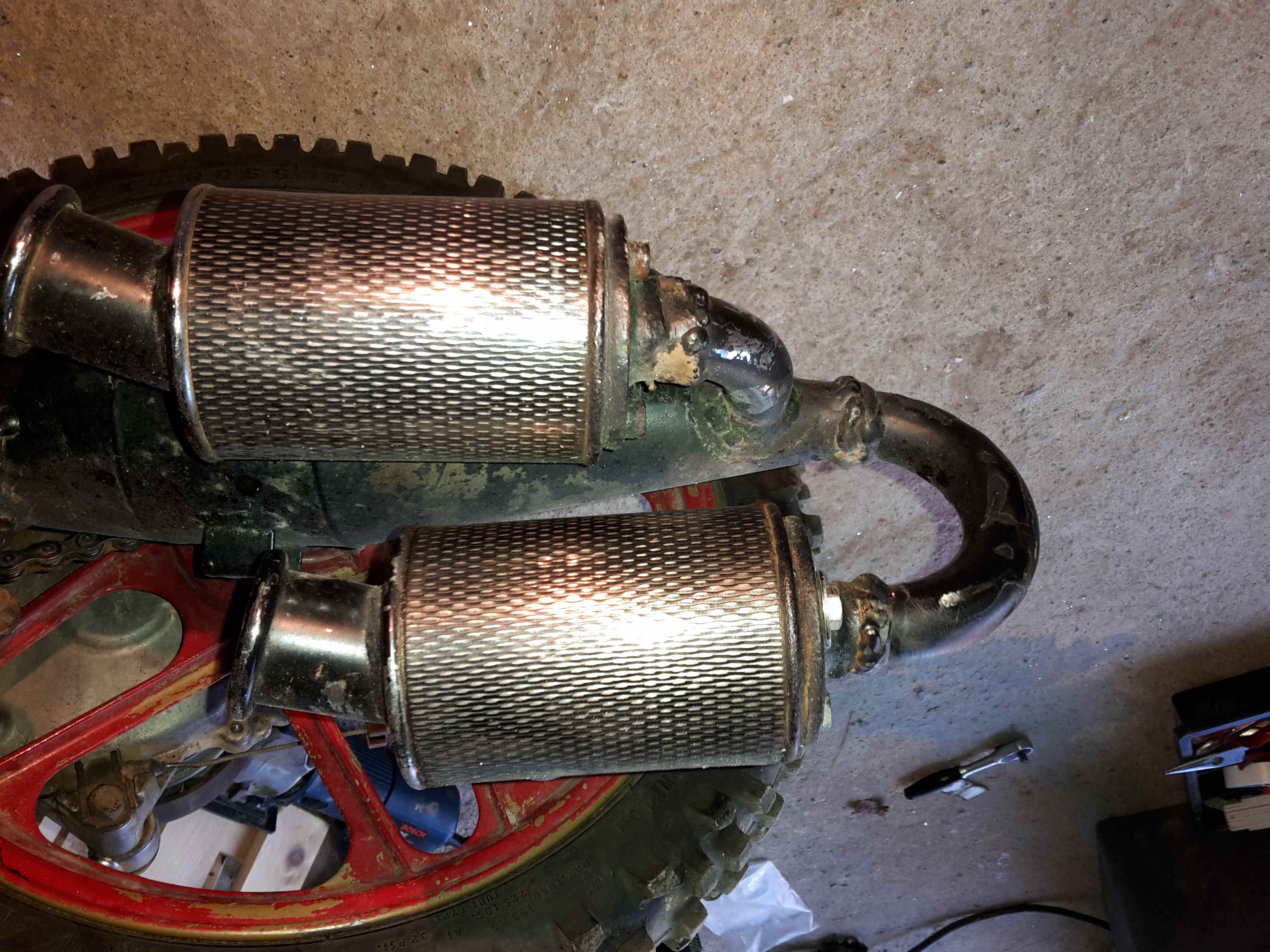 - Auspuff. Ist so ein Reso-Auspuff. Es sind 2 Endtöpfe angeschweißt. Soll wohl ein Gag sein. Ist an mehreren Stellen geschweist. Sieht aber nicht ganz schlecht aus.