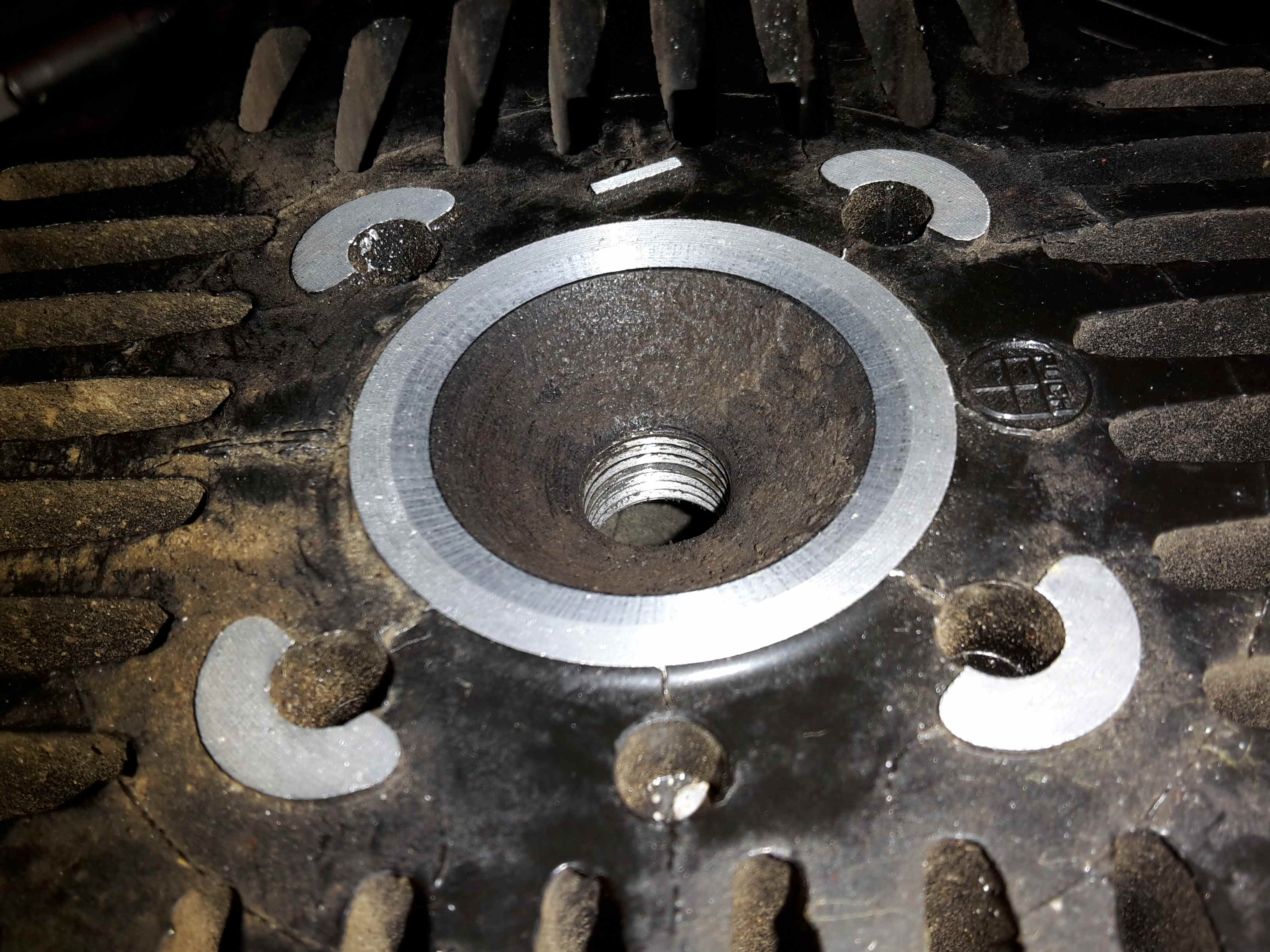 Ja das wollte ich erst so machen. Den Kopf aussen etwas weiter abdrehen und dann in den Brennraum rein ragen lassen. Aber da ich selbst keine Drehbank habe war ich froh als mir jemand den Kopf so abgedreht hat. Man könnte dann besser mit verschiedenen Kopfdichtungen testen. Naja.