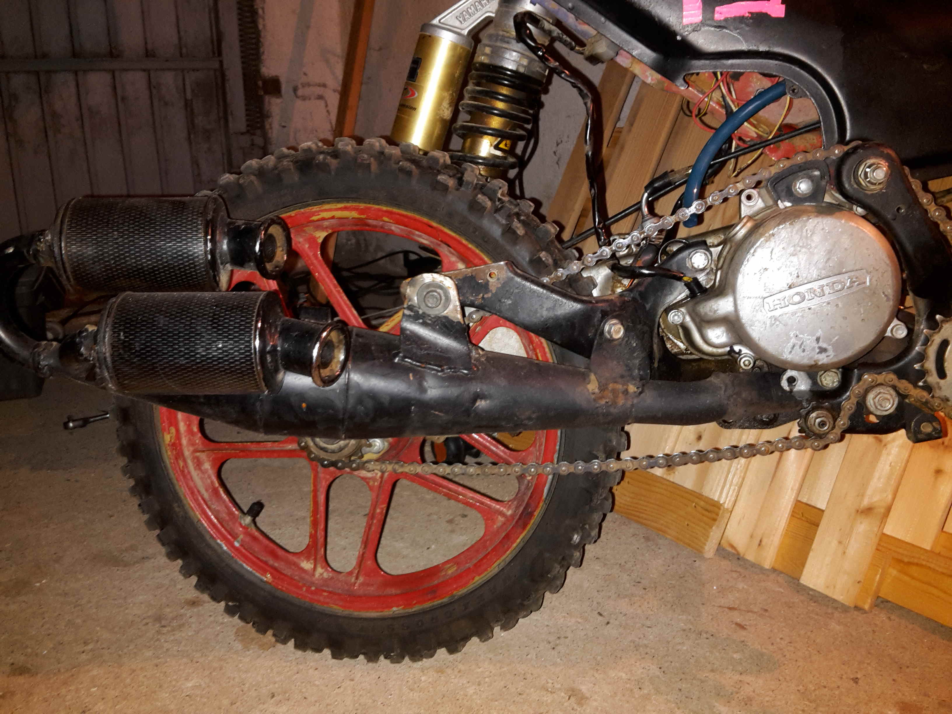 - Auspuff. Ist so ein Reso-Auspuff. Es sind 2 Endtöpfe angeschweißt. Soll wohl ein Gag sein. Ist an mehreren Stellen geschweist. Sieht aber nicht ganz schlecht aus.