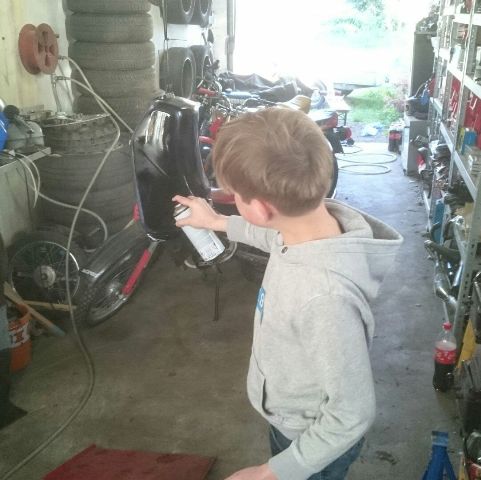 Eine Kinder Simson. Der Sohnemann von meinem Arbeitskollegen ist ab und an mal mit meiner Malaguti Automatik gefahren, wollte jetzt aber mal ein richtiges Moped "mit Schaltung und so" fahren. Naja mit der S51 ging es gar nicht.... Beine viel zu kurz, kam nicht auf den Boden. Hab dann mit meinen Leuten mal in den Kellern und Garagen gesucht und haben auch einiges an Teilen gefunden und da draus haben Jannis und ich dann ein kleines Gefährt zusammen gebaut. Hier das Ergebnis:
