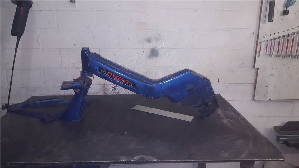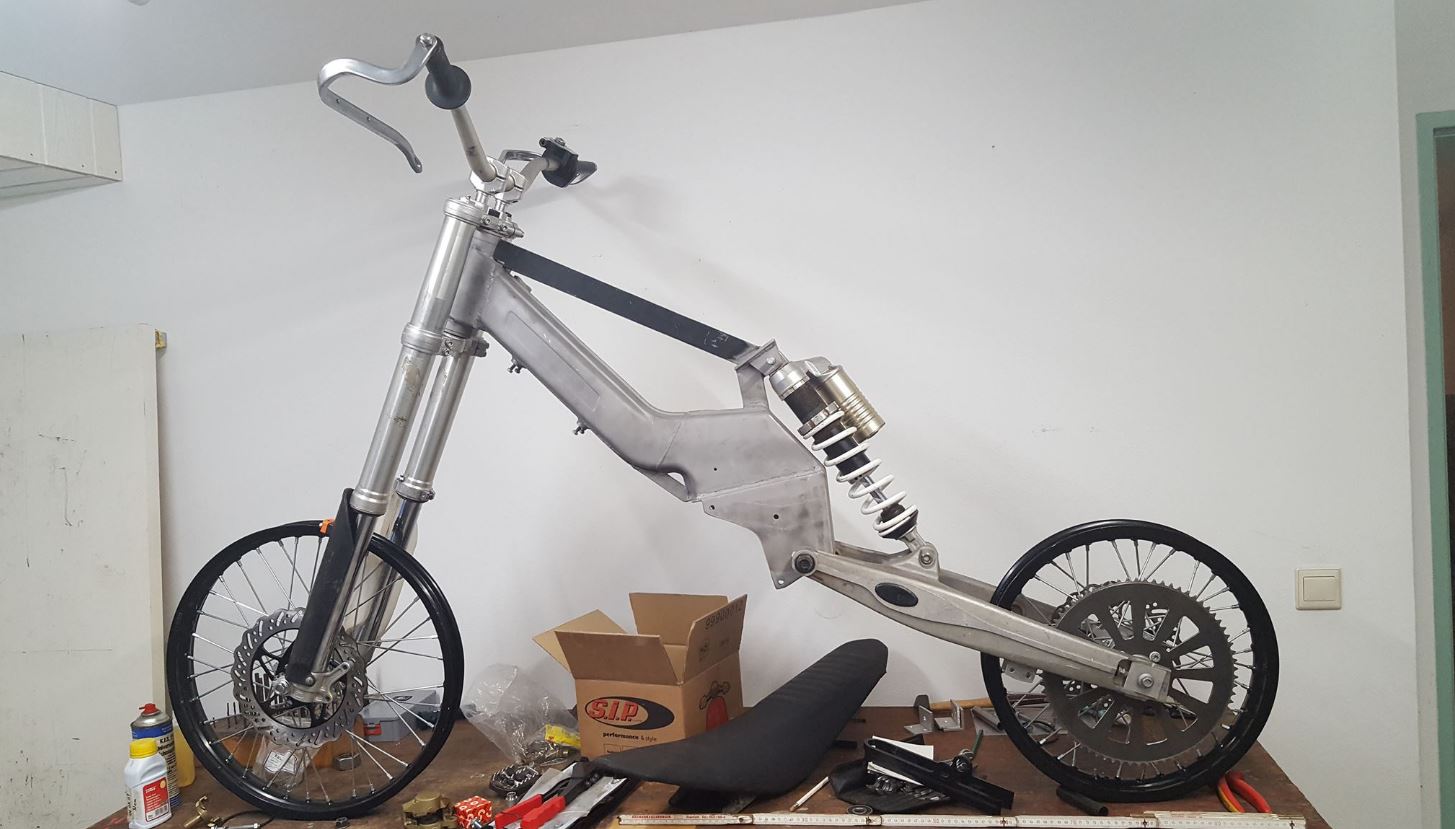 Gestern das Dingen mal zusammengesteckt- Mark alias Hulk hat wieder mal ganze Arbeit geleistet! Der Rahmen ist haupttragender Bestandteil, wurde gewaltig verstärkt, mit allen Erfahrungen aus den ersten Maxis. Lenkkopf ist Original ,aber ringsrum mit Stahl verstärkt (die reißen mal gerne), Motorhalter sind Original, aber auch da gewaltig verstärkt- Ich lasse mal Bilder sprechen.