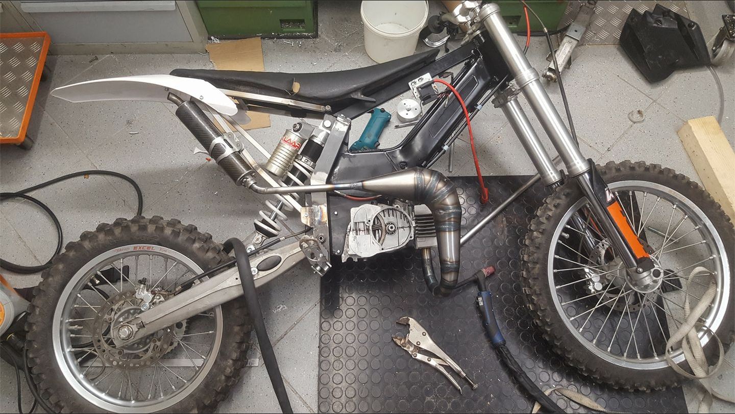 Ein ziemlich vergammelter Maxi-N-Rahmen mit Durchrostung an der Sattelstütze und Doppel-riss an den Heckauslegern dient jetzt als Basis. Übers Jahr habe ich dann mal preiswerte KTM-Teile gesammelt- Gabel, Standrohre, Schwinge, Stoßdämpfer, Sitzbank, Lenker, Handguards, Chinaradsatz- immer für schmales Geld mitgenommen- Ziel sollte sein, das rollende Chassis für 600€ dastehen zu haben. Da gabs dann die Schwinge für 35€, den Dämpfer hinten für 80€, Standrohre für 100, Gabelbrücke für 40, Radsatz für 100- es kommt halt so einiges zusammen, wenn man etwas Geduld hat. Letzte Woche ist mir dann noch eine komplette 2006er SX85 mit Motorschaden zugeflogen- jetzt gibt es Originalräder mit Originalbremsen.. Das Dinge hätte mal Ende letzten Jahres den weg zu mir finden müssen- aber egal. Und- es soll noch nach Mofa aussehen, Wiedererkennungswert wäre auch nicht schlecht.