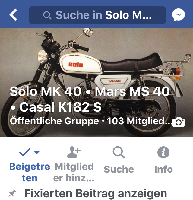 Solo MK 40 / Mars MS 40 Mokick Fahrer 9. Juni 2017, 08:49 Hallo, gibt es hier auch Solo MK40 oder Mars MS40 Fahrer? Solo MK40 Facebook Gruppe: facebook.com/groups/128565191015380/ Werbung zur Finanzierung des Forums Dieser Beitrag wurde bereits 1 mal editiert, zuletzt von „Pedro Casalero“ (9. Juni 2017, 09:28)