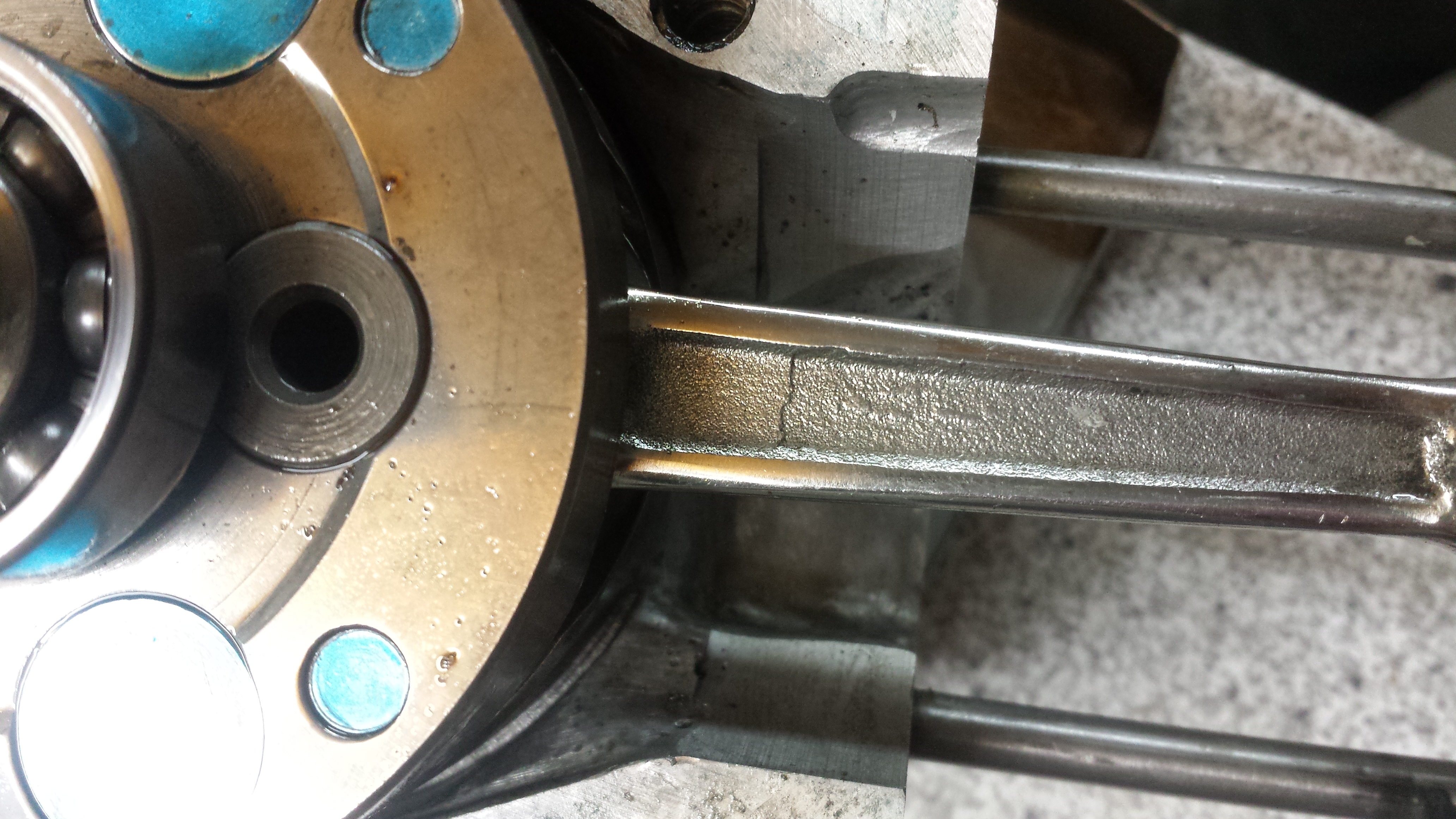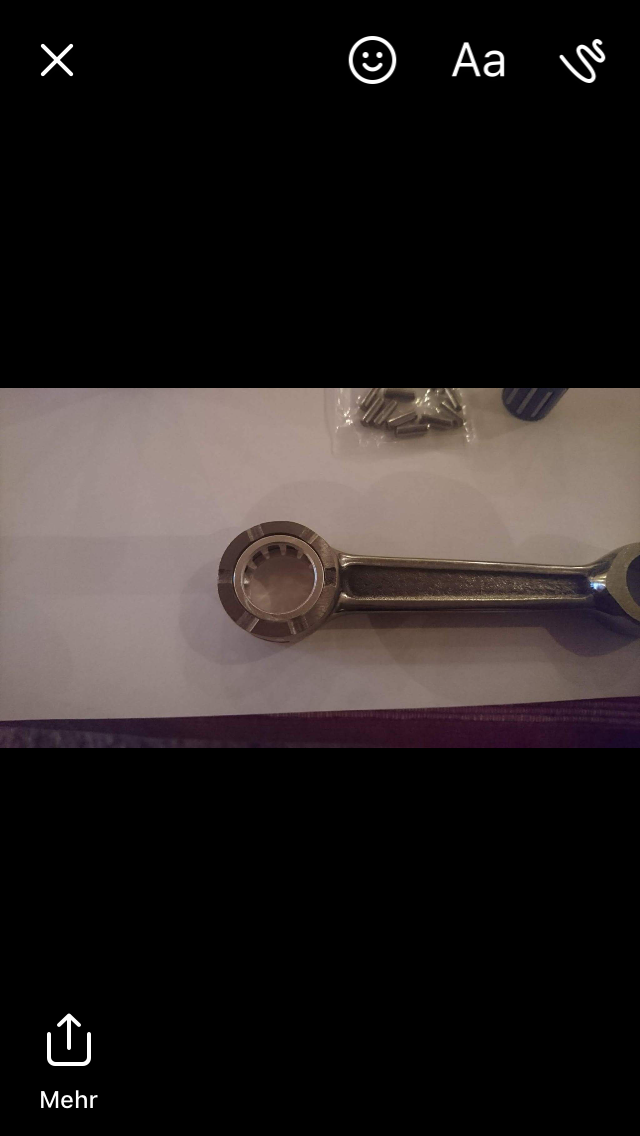 Ich hab auch jetzt wieder Glück gehabt und nehme alles zurück was ich über die Haltbarkeit behauptet habe.... Man beachte die Mitte des Pleuel's,ein schöner Riß. Jetzt fliegen die Dinger nicht mehr am Auge auseinander sondern willkürlich irgendwo. Man muss dazu sagen das der ganze Motor wirklich am Limit des machbaren läuft,mit dem SX Zylinder. Nach 7Bh ist wirklich alles im Sack. Auch die Bauteile welche als ausgereift schienen. Ich geh zurück und wuchte auf Samarin.