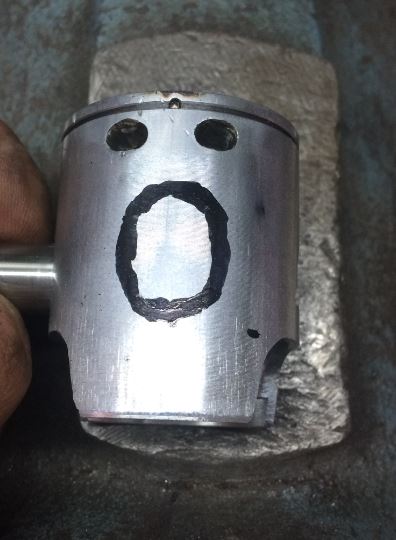 Auf der Zylinderlaufbahn ist mir nun eine "Markierung" aufgefallen, diese ist praktisch da wo der Kolben den unteren Totpunkt durchläuft, also die Oberkante. Sie ist nicht wegzuwischen, ist also in die Oberfläche eingedrungen.